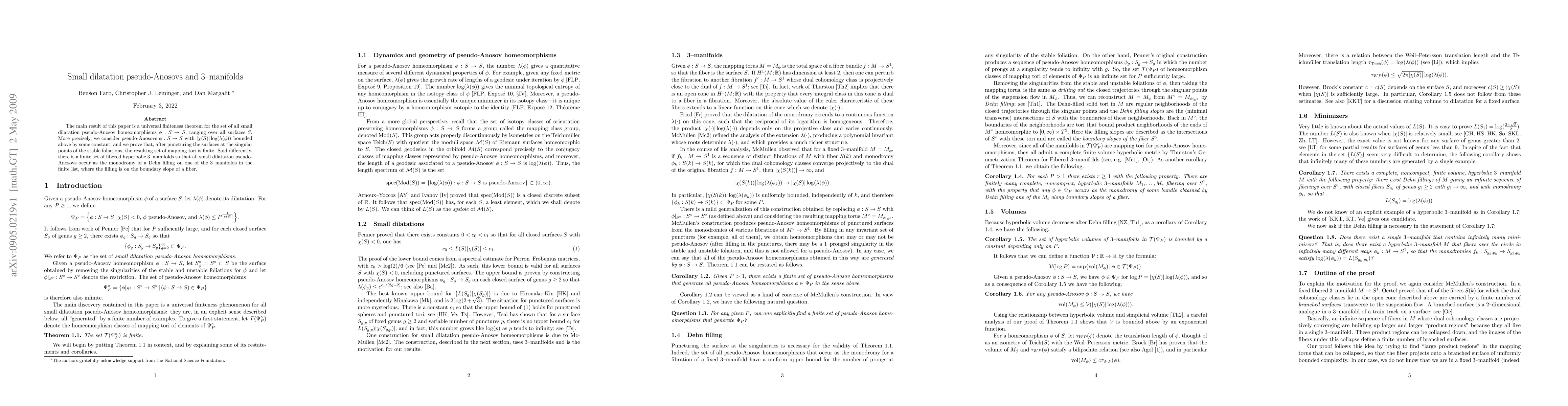 This paper establishes a universal finiteness theorem for small dilatation pseudo-Anosov homeomorphisms on surfaces, proving that after puncturing the surfaces, the set of resulting mapping tori is finite. It shows that all such pseudo-Anosovs can be the monodromy of a Dehn filling on a boundary slope of a fibered hyperbolic 3-manifold from a finite list.