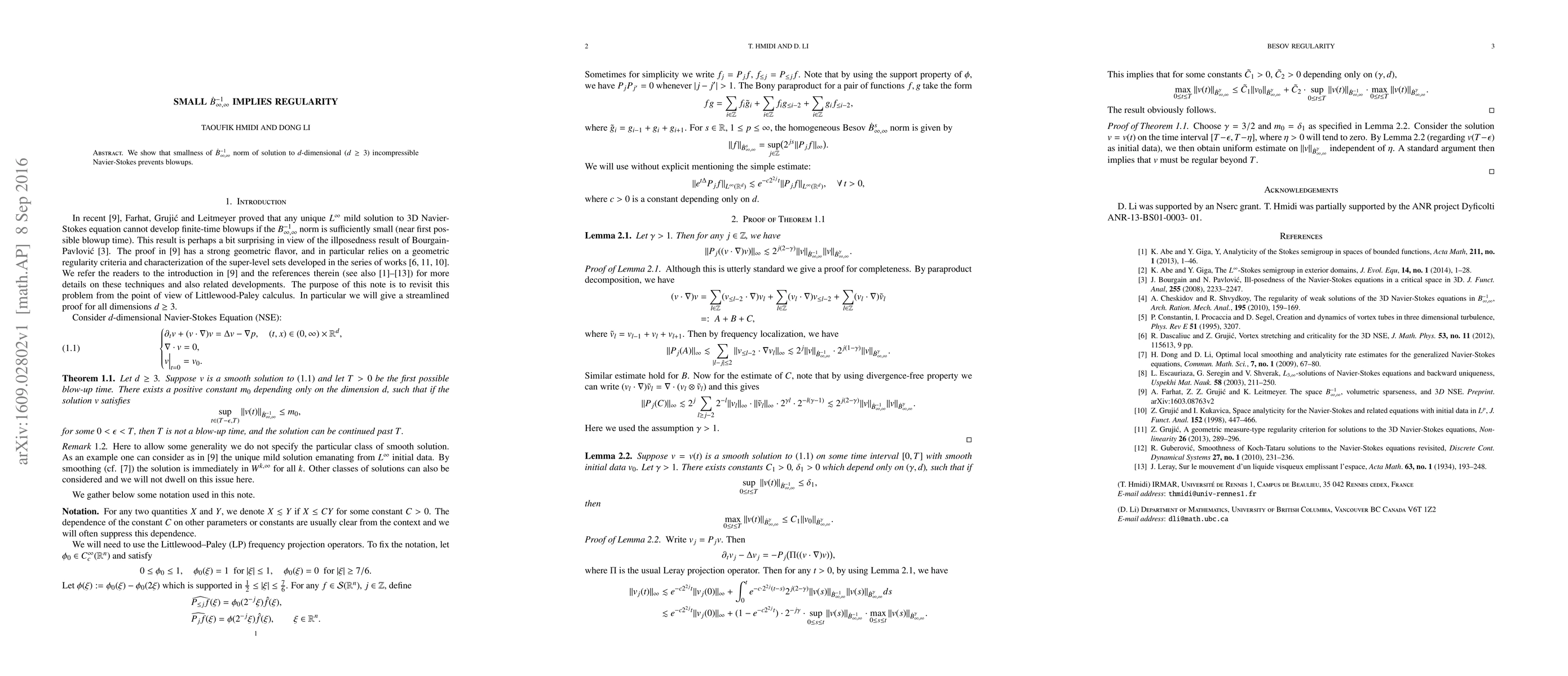 Small $ ilde B^{-1}_{ ext{infty}, ext{infty}}$ norm in 3D Navier-Stokes prevents blowups, supporting the idea that smallness of certain norms implies regularity.