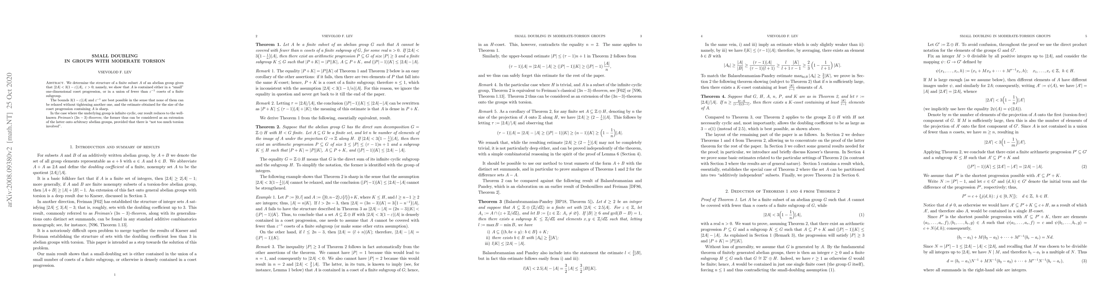 We determine the structure of a finite subset $A$ of an abelian group given that $|2A|<3(1-\epsilon)|A|$, $\epsilon>0$; namely, we show that $A$ is contained either in a "small" one-dimensional coset progression, or in a union of fewer than $\epsilon^{-1}$ cosets of a finite subgroup. The bounds $3(1-\epsilon)|A|$ and $\epsilon^{-1}$ are best possible in the sense that none of them can be relaxed without tightened another one, and the estimate obtained for the size of the coset progression containing $A$ is sharp. In the case where the underlying group is infinite cyclic, our result reduces to the well-known Freiman's $(3n-3)$-theorem; the former thus can be considered as an extension of the latter onto arbitrary abelian groups, provided that there is "not too much torsion involved".