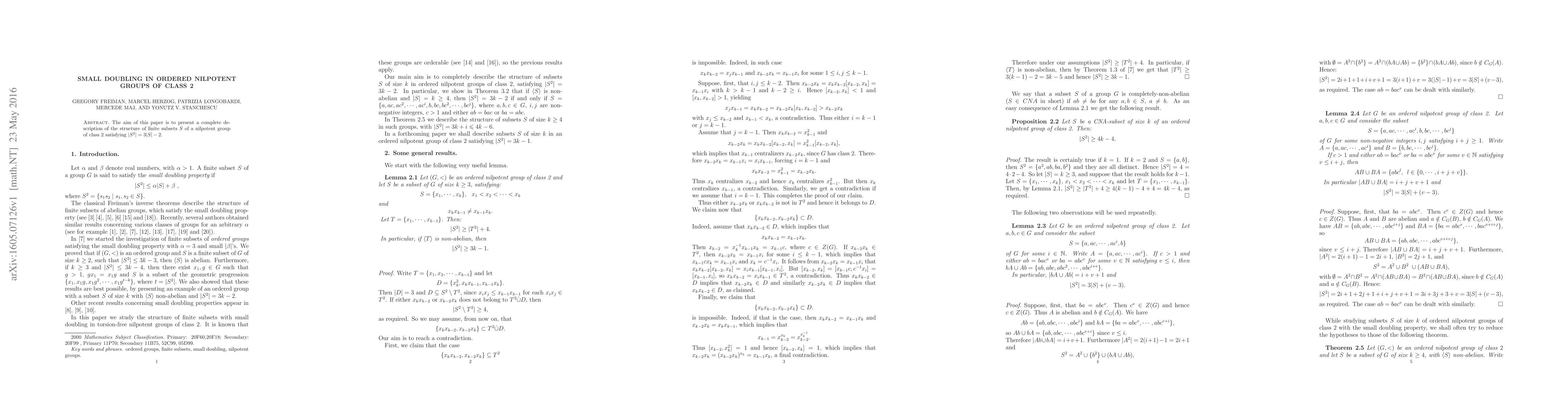 This paper provides a comprehensive analysis of finite subsets in ordered nilpotent groups of class 2 that exhibit a small doubling property, elucidating their structural characteristics. The findings contribute to a deeper understanding of the combinatorial properties within these specific algebraic structures.