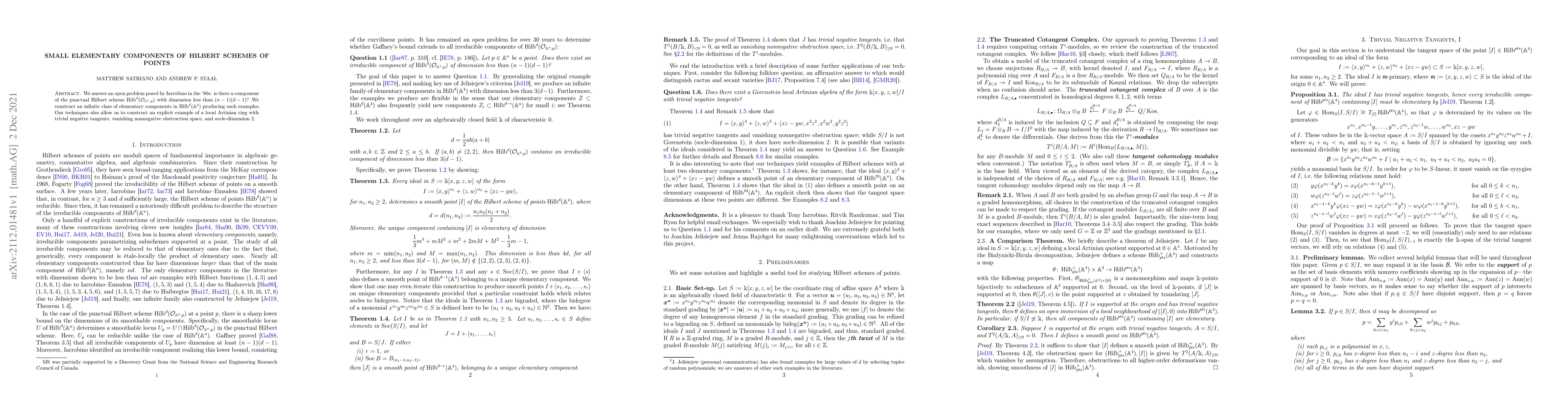 This paper resolves an open question from the '80s by constructing an infinite class of elementary components in Hilbert schemes of points $\textrm{Hilb}^d(\mathbb{A}^4)$ with dimensions less than $(n-1)(d-1)$. The authors also provide an explicit example of a local Artinian ring with specific properties.