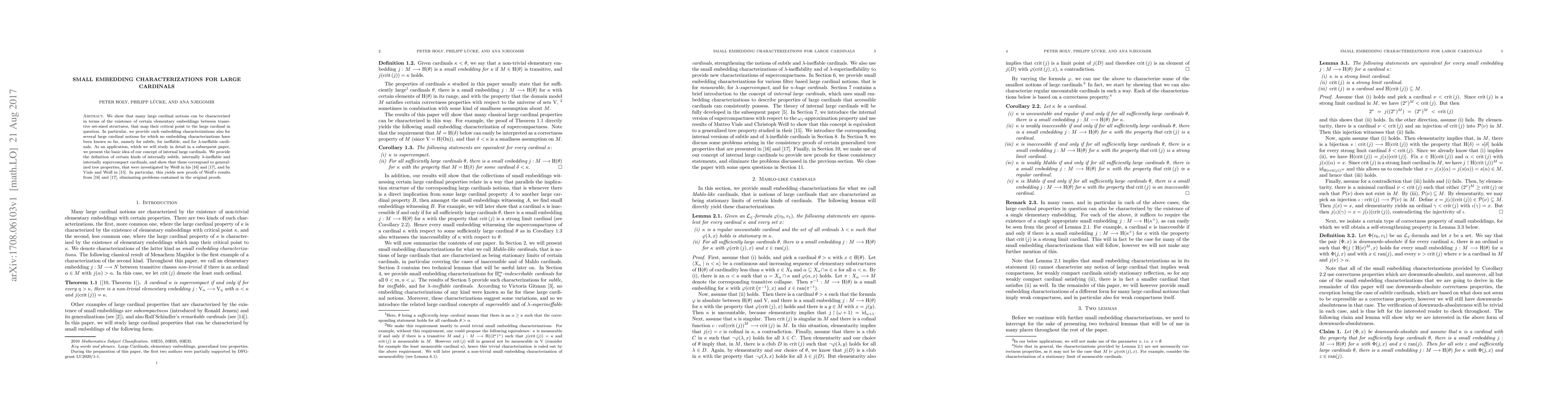 We show that many large cardinal notions can be characterized in terms of the existence of certain elementary embeddings between transitive set-sized structures, that map their critical point to the large cardinal in question. In particular, we provide such embedding characterizations also for several large cardinal notions for which no embedding characterizations have been known so far, namely for subtle, for ineffable, and for $\lambda$-ineffable cardinals. As an application, which we will study in detail in a subsequent paper, we present the basic idea of our concept of internal large cardinals. We provide the definition of certain kinds of internally subtle, internally $\lambda$-ineffable and internally supercompact cardinals, and show that these correspond to generalized tree properties, that were investigated by Wei\ss\ in his [16] and [17], and by Viale and Wei\ss\ in [15]. In particular, this yields new proofs of Wei\ss 's results from [16] and [17], eliminating problems contained in the original proofs.