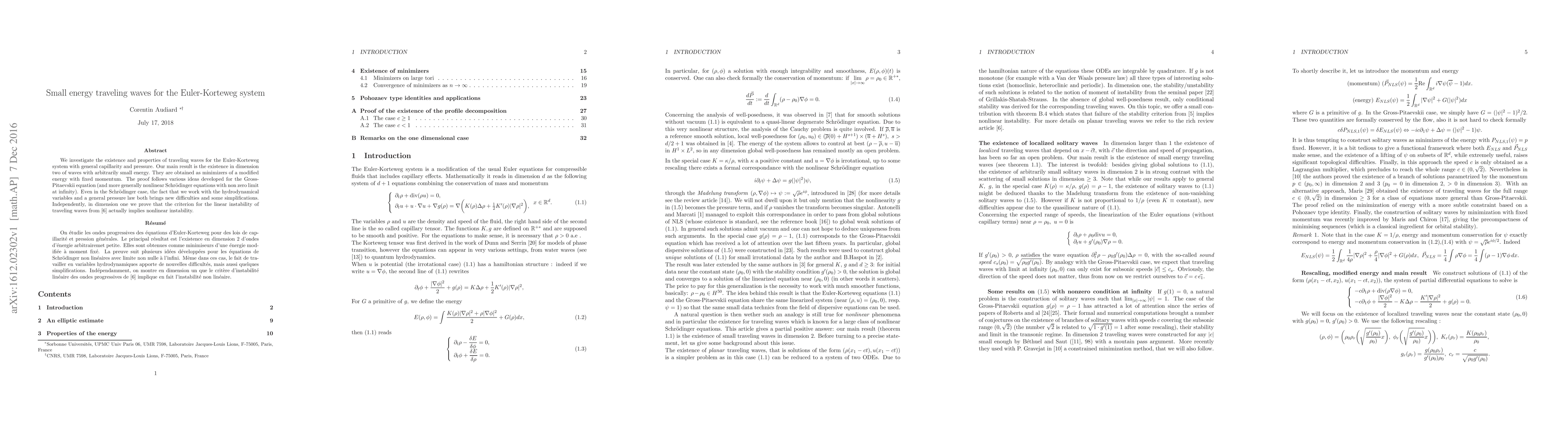 This paper investigates the existence of small energy traveling waves for the Euler-Korteweg system, demonstrating the presence of such waves in two dimensions as minimizers of a modified energy. The study also proves nonlinear instability in one dimension based on the linear instability criterion.