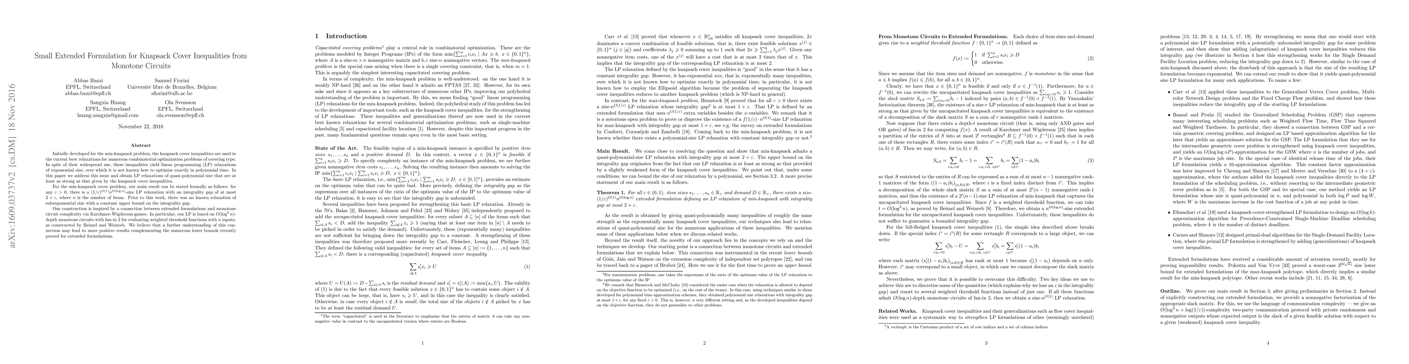 Initially developed for the min-knapsack problem, the knapsack cover inequalities are used in the current best relaxations for numerous combinatorial optimization problems of covering type. In spite of their widespread use, these inequalities yield linear programming (LP) relaxations of exponential size, over which it is not known how to optimize exactly in polynomial time. In this paper we address this issue and obtain LP relaxations of quasi-polynomial size that are at least as strong as that given by the knapsack cover inequalities. For the min-knapsack cover problem, our main result can be stated formally as follows: for any $\varepsilon >0$, there is a $(1/\varepsilon)^{O(1)}n^{O(\log n)}$-size LP relaxation with an integrality gap of at most $2+\varepsilon$, where $n$ is the number of items. Prior to this work, there was no known relaxation of subexponential size with a constant upper bound on the integrality gap. Our construction is inspired by a connection between extended formulations and monotone circuit complexity via Karchmer-Wigderson games. In particular, our LP is based on $O(\log^2 n)$-depth monotone circuits with fan-in~$2$ for evaluating weighted threshold functions with $n$ inputs, as constructed by Beimel and Weinreb. We believe that a further understanding of this connection may lead to more positive results complementing the numerous lower bounds recently proved for extended formulations.