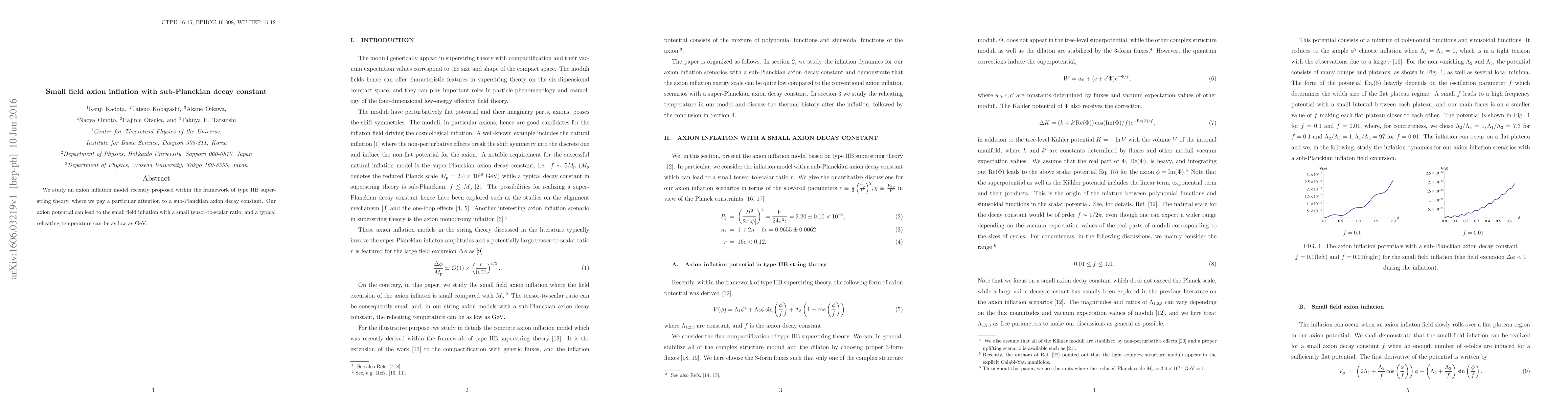This paper explores an axion inflation model from type IIB superstring theory featuring a sub-Planckian decay constant, achieving small field inflation with a low tensor-to-scalar ratio and a reheating temperature around GeV. The model's potential supports viable inflationary dynamics.