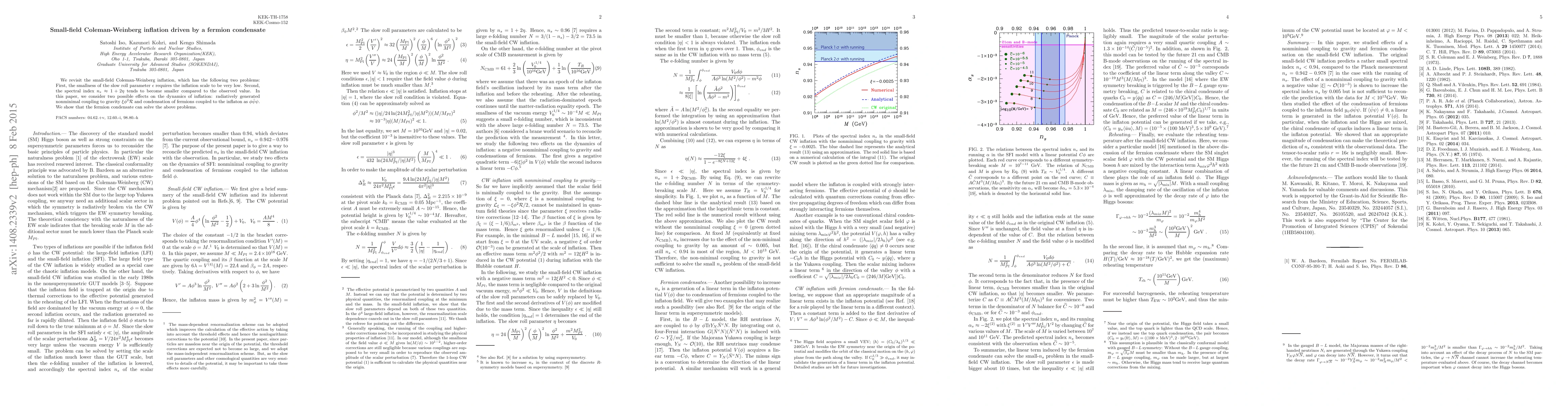 We revisit the small field Coleman-Weinberg (CW) inflation, which has the following two problems. First, the smallness of the slow roll parameter $\epsilon$ requires the inflation scale to be very low. Second, the spectral index $n_s \approx1+2 \eta$ tends to become smaller compared to the observed value. In this letter, we consider two possible effects on the dynamics of inflation: radiatively generated non-minimal coupling to gravity $\xi \phi^2 {\cal R}$ and condensation of fermions coupled to the inflaton as $\phi \bar\psi \psi$. We show that the fermion condenate can solve the above problems.