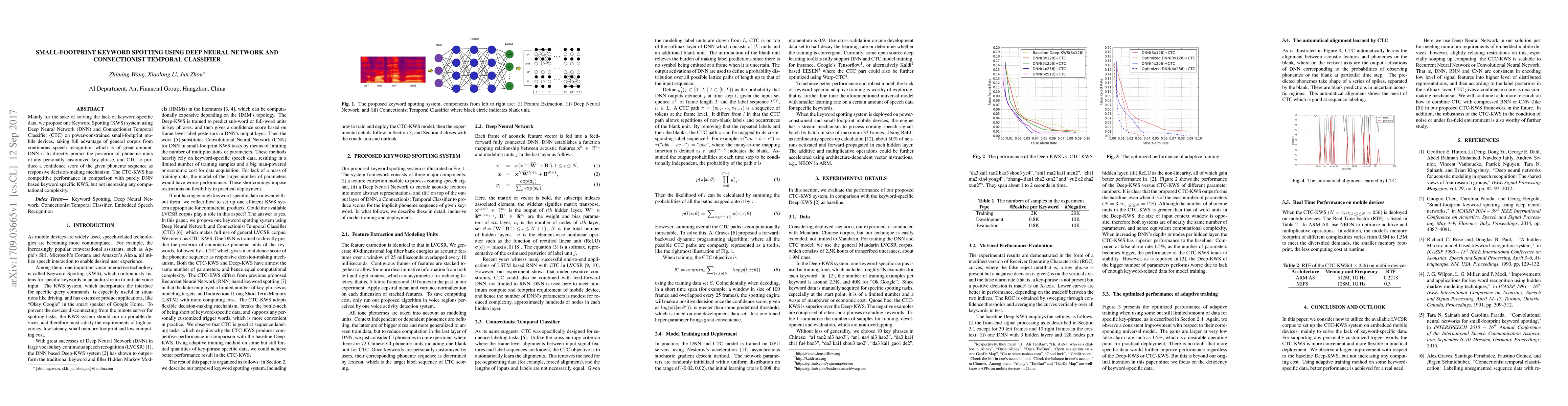 This paper proposes a small-footprint Keyword Spotting system using Deep Neural Network (DNN) and Connectionist Temporal Classifier (CTC) to address the scarcity of keyword-specific data, leveraging a large general corpus from continuous speech recognition. The DNN predicts phoneme units for customized key-phrases, while CTC provides a confidence score, achieving competitive performance without increasing computational complexity.