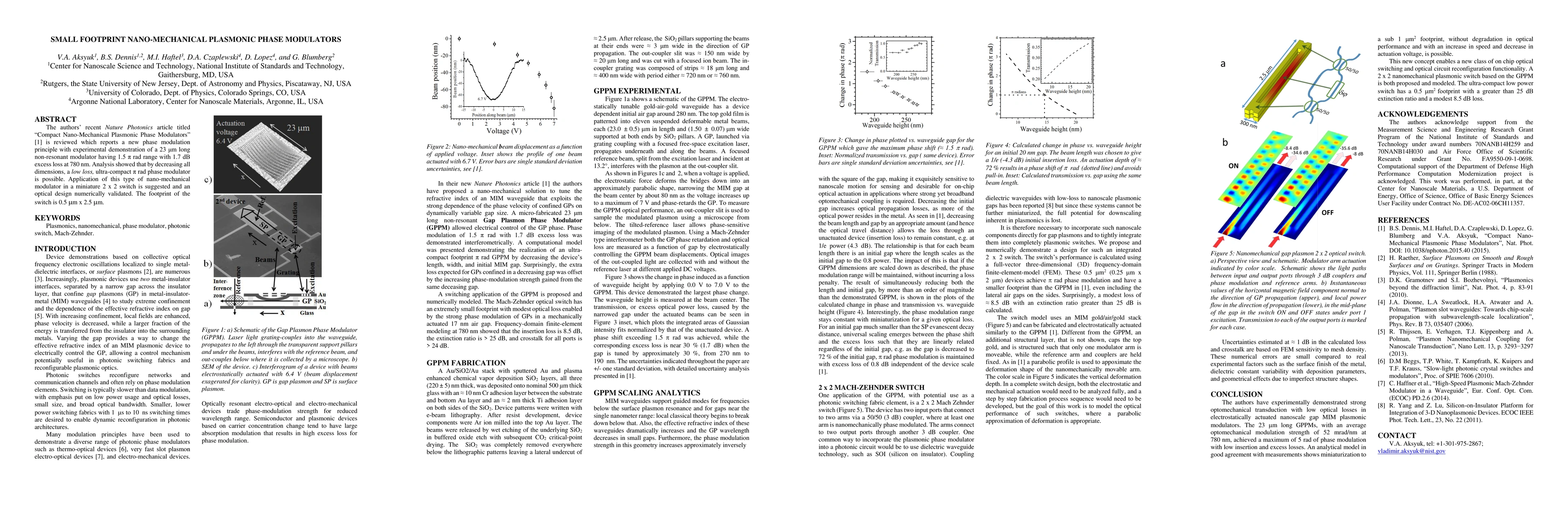 This paper reviews a compact nano-mechanical plasmonic phase modulator demonstrating a 23 μm long modulator with a 1.5 π rad range and 1.7 dB excess loss at 780 nm. The authors propose that further miniaturization could yield a low-loss ultra-compact π rad phase modulator, suggesting its application in a miniature 2 x 2 optical switch with a footprint of 0.5 μm x 2.5 μm.