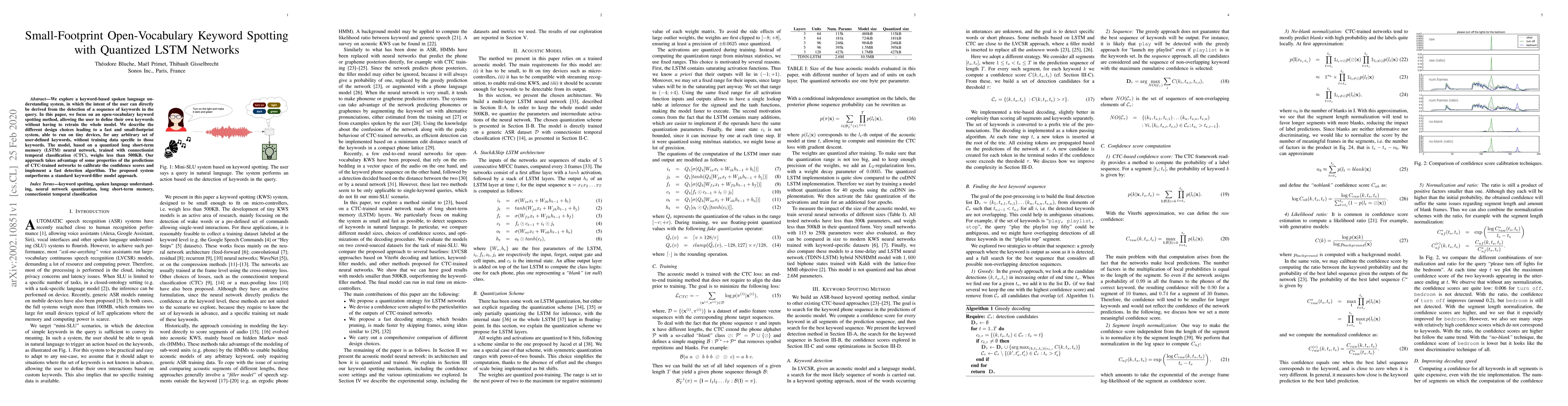 This paper presents a small-footprint, open-vocabulary keyword spotting system using quantized LSTM networks, enabling detection of user-defined keywords without requiring model retraining. The lightweight model, weighing under 500KB, leverages CTC and optimized confidence calibration for efficient operation on tiny devices.
