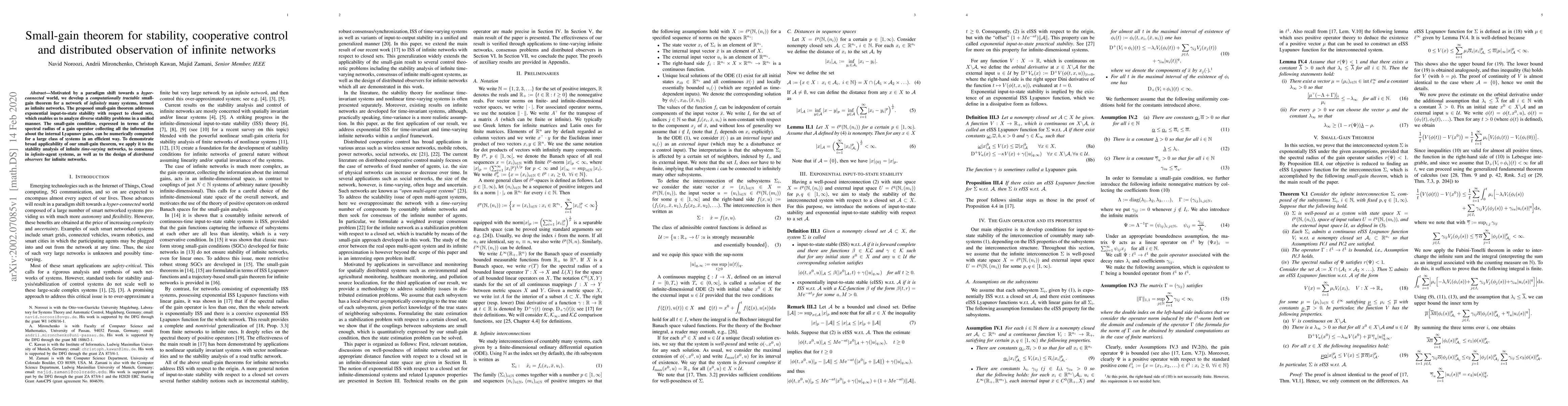This paper proposes a computationally efficient small-gain theorem for analyzing stability in infinite networks, addressing exponential input-to-state stability. It applies the theorem to stability analysis, consensus in infinite-agent systems, and distributed observer design.