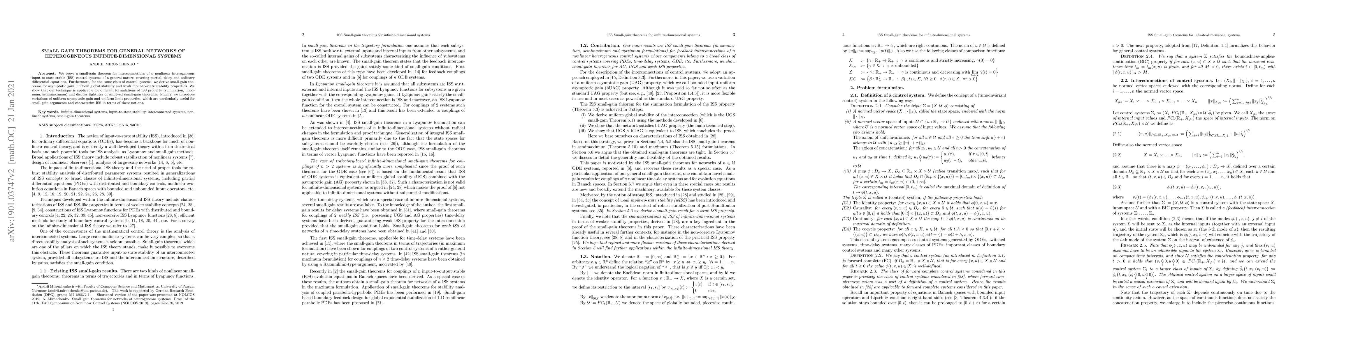 We prove a small-gain theorem for interconnections of $n$ nonlinear heterogeneous input-to-state stable (ISS) control systems of a general nature, covering partial, delay and ordinary differential equations. Furthermore, for the same class of control systems, we derive small-gain theorems for asymptotic gain, uniform global stability and weak input-to-state stability properties. We show that our technique is applicable for different formulations of ISS property (summation, maximum, semimaximum) and discuss tightness of achieved small-gain theorems. Finally, we introduce variations of uniform asymptotic gain and uniform limit properties, which are particularly useful for small-gain arguments and characterize ISS in terms of these notions.