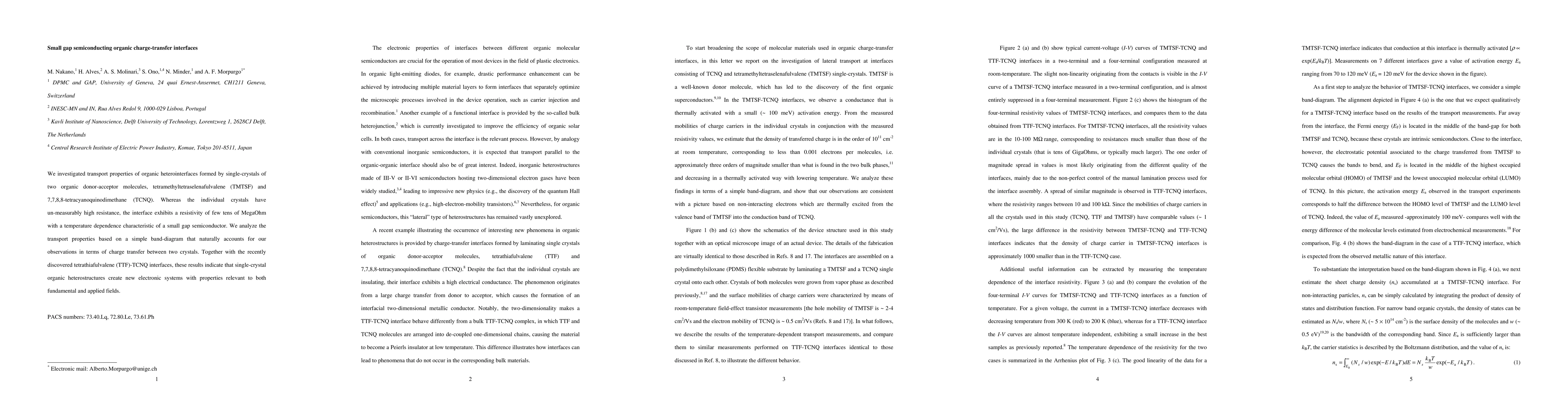 This study investigates the transport properties of organic heterointerfaces formed by single-crystals of TMTSF and TCNQ, revealing a small gap semiconducting behavior at the interface with measurable resistivity. The observed charge transfer between the crystals suggests potential for new electronic systems in both fundamental and applied research.