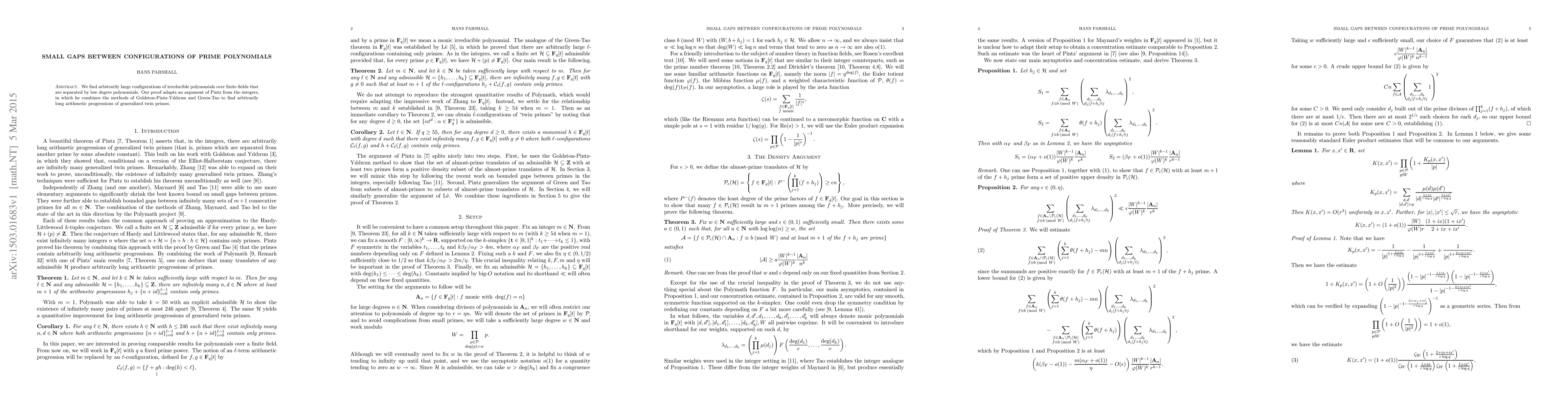 We find arbitrarily large configurations of irreducible polynomials over finite fields that are separated by low degree polynomials. Our proof adapts an argument of Pintz from the integers, in which he combines the methods of Goldston-Pintz-Y\i ld\i r\i m and Green-Tao to find arbitrarily long arithmetic progressions of generalized twin primes.