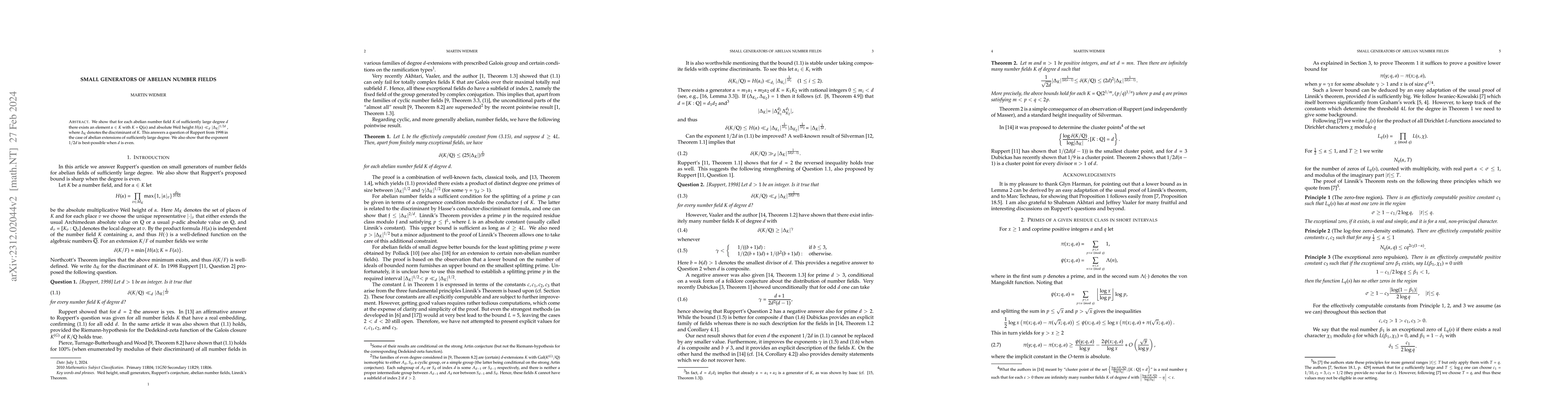 This paper proves the existence of small generators for abelian number fields of sufficiently large degree, where the generators have absolute Weil height bounded by a function of the field's discriminant. It verifies a conjecture by Ruppert and establishes that the exponent in the height bound is optimal for even degrees.