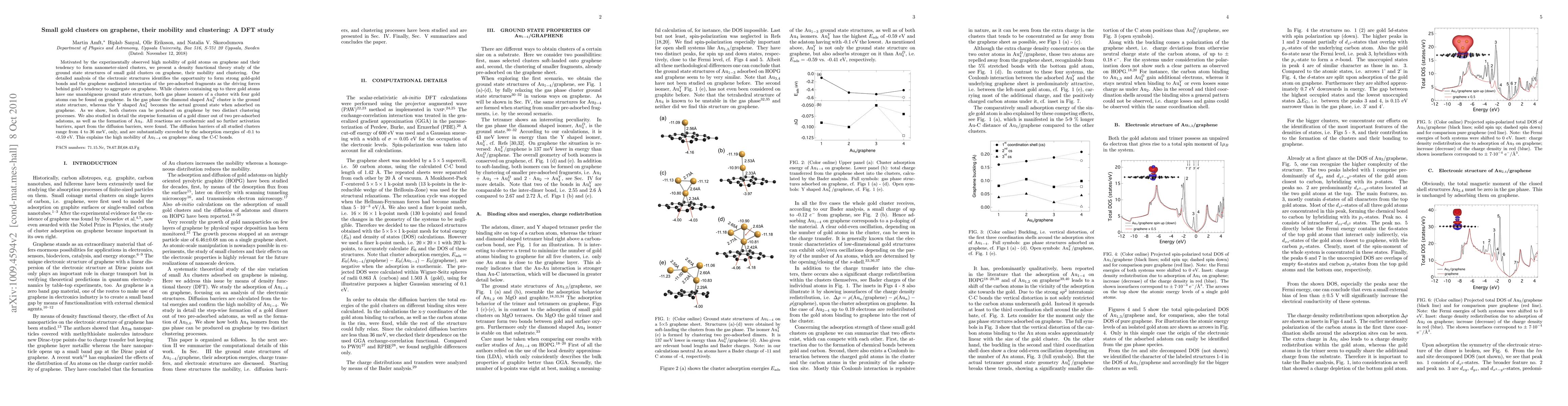 This DFT study investigates the mobility and clustering behavior of small gold clusters on graphene, revealing strong gold-gold bonds and graphene-mediated interactions as key factors for aggregation. The analysis shows that while clusters up to three gold atoms have a single ground state, a four-gold atom cluster can adopt different shapes depending on its environment, with the Y-shaped Au$_{4}^{Y}$ being the ground state on graphene.