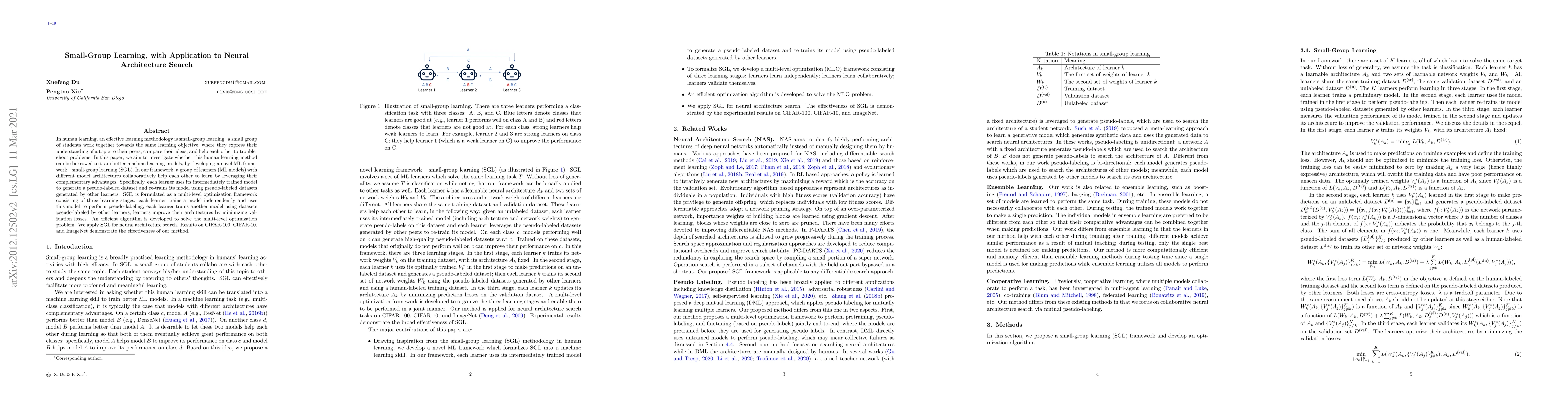 In human learning, an effective learning methodology is small-group learning: a small group of students work together towards the same learning objective, where they express their understanding of a topic to their peers, compare their ideas, and help each other to trouble-shoot problems. In this paper, we aim to investigate whether this human learning method can be borrowed to train better machine learning models, by developing a novel ML framework -- small-group learning (SGL). In our framework, a group of learners (ML models) with different model architectures collaboratively help each other to learn by leveraging their complementary advantages. Specifically, each learner uses its intermediately trained model to generate a pseudo-labeled dataset and re-trains its model using pseudo-labeled datasets generated by other learners. SGL is formulated as a multi-level optimization framework consisting of three learning stages: each learner trains a model independently and uses this model to perform pseudo-labeling; each learner trains another model using datasets pseudo-labeled by other learners; learners improve their architectures by minimizing validation losses. An efficient algorithm is developed to solve the multi-level optimization problem. We apply SGL for neural architecture search. Results on CIFAR-100, CIFAR-10, and ImageNet demonstrate the effectiveness of our method.