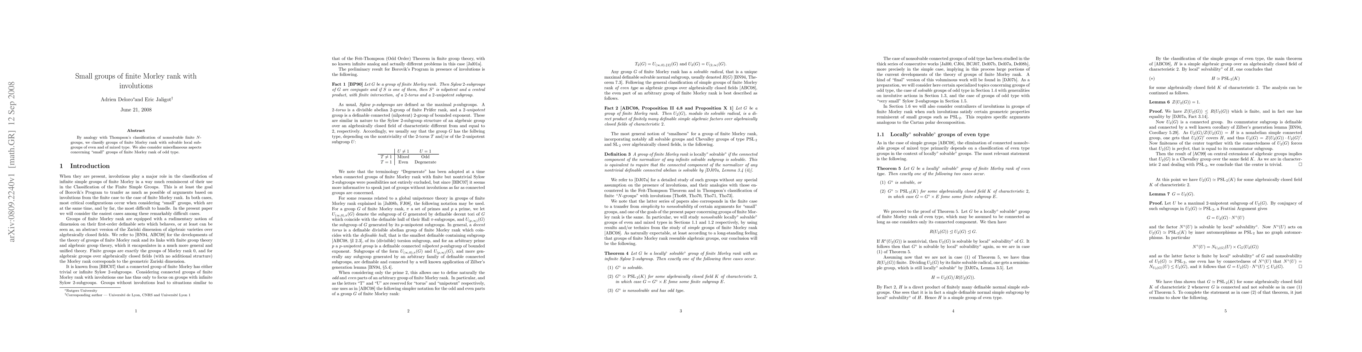 Summary: This paper examines groups of finite Morley rank with solvable local subgroups, focusing on those with involutions and exploring various characteristics of small groups of odd type.