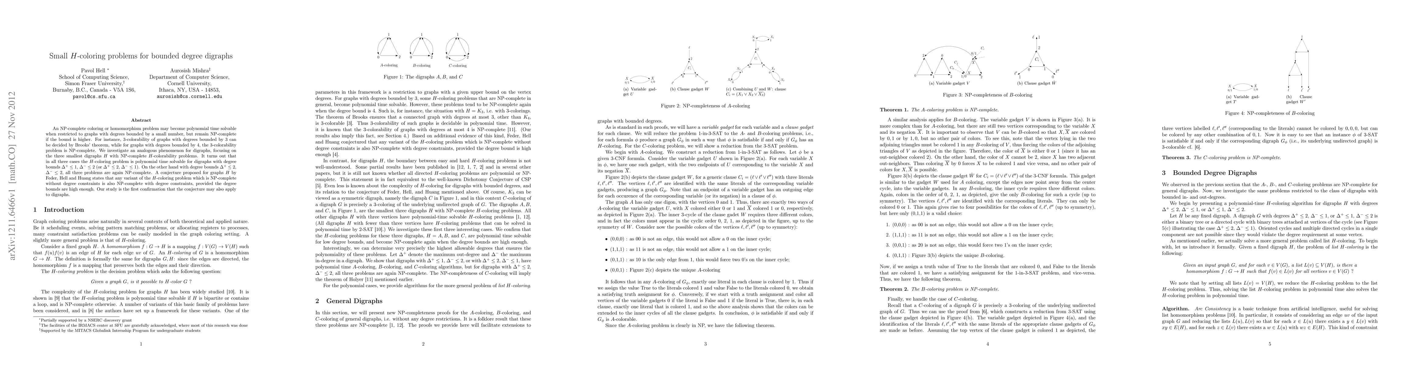 An NP-complete coloring or homomorphism problem may become polynomial time solvable when restricted to graphs with degrees bounded by a small number, but remain NP-complete if the bound is higher. For instance, 3-colorability of graphs with degrees bounded by 3 can be decided by Brooks' theorem, while for graphs with degrees bounded by 4, the 3-colorability problem is NP-complete. We investigate an analogous phenomenon for digraphs, focusing on the three smallest digraphs H with NP-complete H-colorability problems. It turns out that in all three cases the H-coloring problem is polynomial time solvable for digraphs with degree bounds $\Delta^{+} \leq 1$, $\Delta^{-} \leq 2$ (or $\Delta^{+} \leq 2$, $\Delta^{-} \leq 1$). On the other hand with degree bounds $\Delta^{+} \leq 2$, $\Delta^{-} \leq 2$, all three problems are again NP-complete. A conjecture proposed for graphs H by Feder, Hell and Huang states that any variant of the $H$-coloring problem which is NP-complete without degree constraints is also NP-complete with degree constraints, provided the degree bounds are high enough. Our study is the first confirmation that the conjecture may also apply to digraphs.