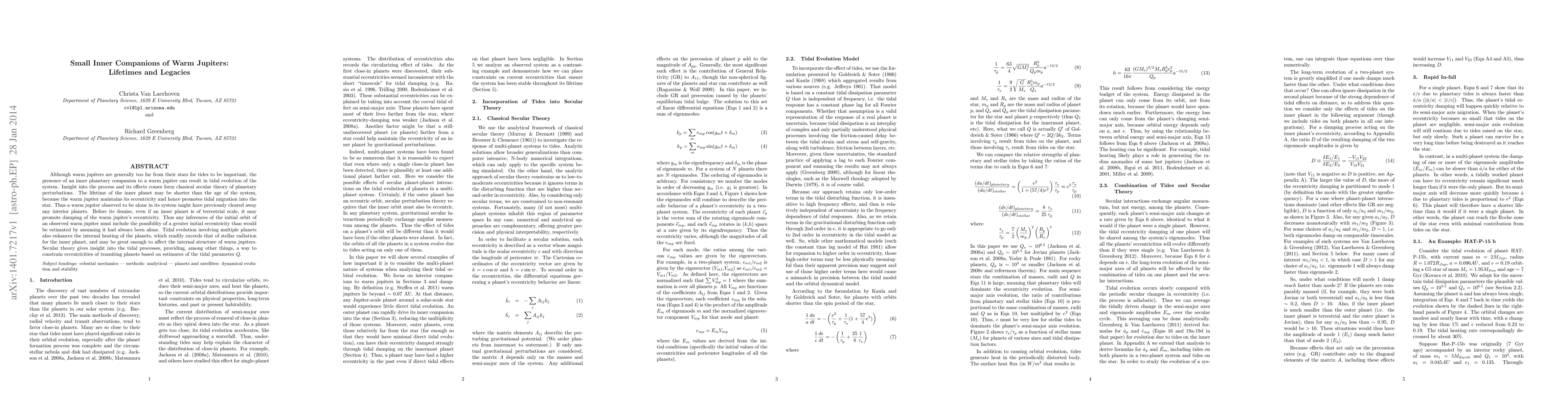 Although warm jupiters are generally too far from their stars for tides to be important, the presence of an inner planetary companion to a warm jupiter can result in tidal evolution of the system. Insight into the process and its effects comes form classical secular theory of planetary perturbations. The lifetime of the inner planet may be shorter than the age of the system, because the warm jupiter maintains its eccentricity and hence promotes tidal migration into the star. Thus a warm jupiter observed to be alone in its system might have previously cleared away any interior planets. Before its demise, even if an inner planet is of terrestrial scale, it may promote damping of the warm jupiter's eccentricity. Thus any inferences of the initial orbit of an observed warm jupiter must include the possibility of a greater initial eccentricity than would be estimated by assuming it had always been alone. Tidal evolution involving multiple planets also enhances the internal heating of the planets, which readily exceeds that of stellar radiation for the inner planet, and may be great enough to affect the internal structure of warm jupiters. Secular theory gives insight into the tidal processes, providing, among other things, a way to constrain eccentricities of transiting planets based on estimates of the tidal parameter Q.