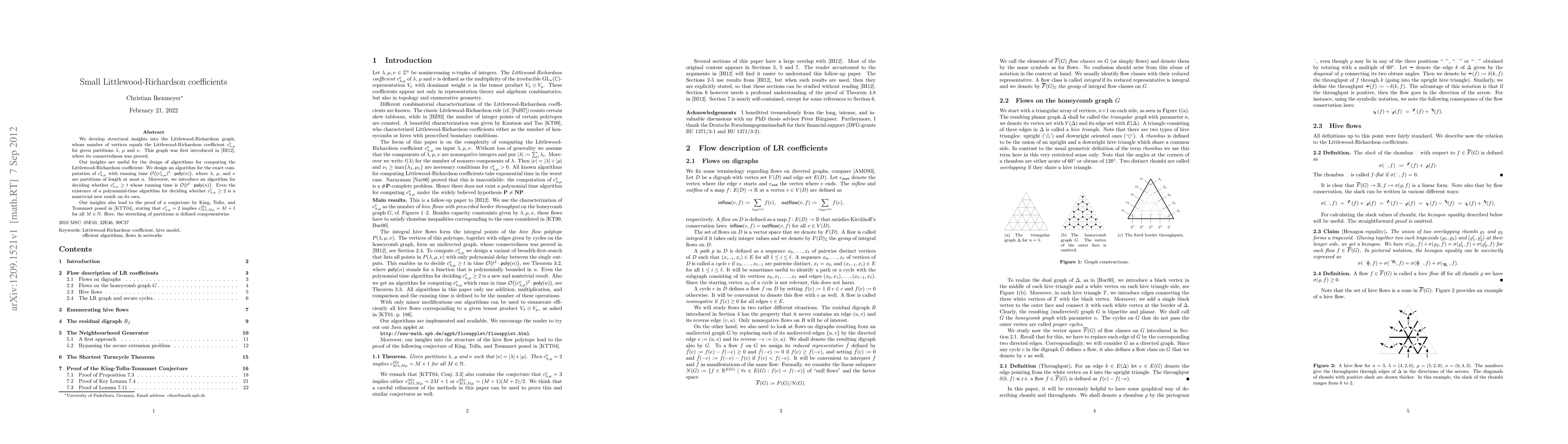 We develop structural insights into the Littlewood-Richardson graph, whose number of vertices equals the Littlewood-Richardson coefficient c({\lambda},{\mu},{\nu}) for given partitions {\lambda}, {\mu}, and {\nu}. This graph was first introduced by B\"urgisser and Ikenmeyer in arXiv:1204.2484, where its connectedness was proved. Our insights are useful for the design of algorithms for computing the Littlewood-Richardson coefficient: We design an algorithm for the exact computation of c({\lambda},{\mu},{\nu}) with running time O(c({\lambda},{\mu},{\nu})^2 poly(n)), where {\lambda}, {\mu}, and {\nu} are partitions of length at most n. Moreover, we introduce an algorithm for deciding whether c({\lambda},{\mu},{\nu}) >= t whose running time is O(t^2 poly(n)). Even the existence of a polynomial-time algorithm for deciding whether c({\lambda},{\mu},{\nu}) >= 2 is a nontrivial new result on its own. Our insights also lead to the proof of a conjecture by King, Tollu, and Toumazet posed in 2004, stating that c({\lambda},{\mu},{\nu}) = 2 implies c(M{\lambda},M{\mu},M{\nu}) = M + 1 for all M. Here, the stretching of partitions is defined componentwise.