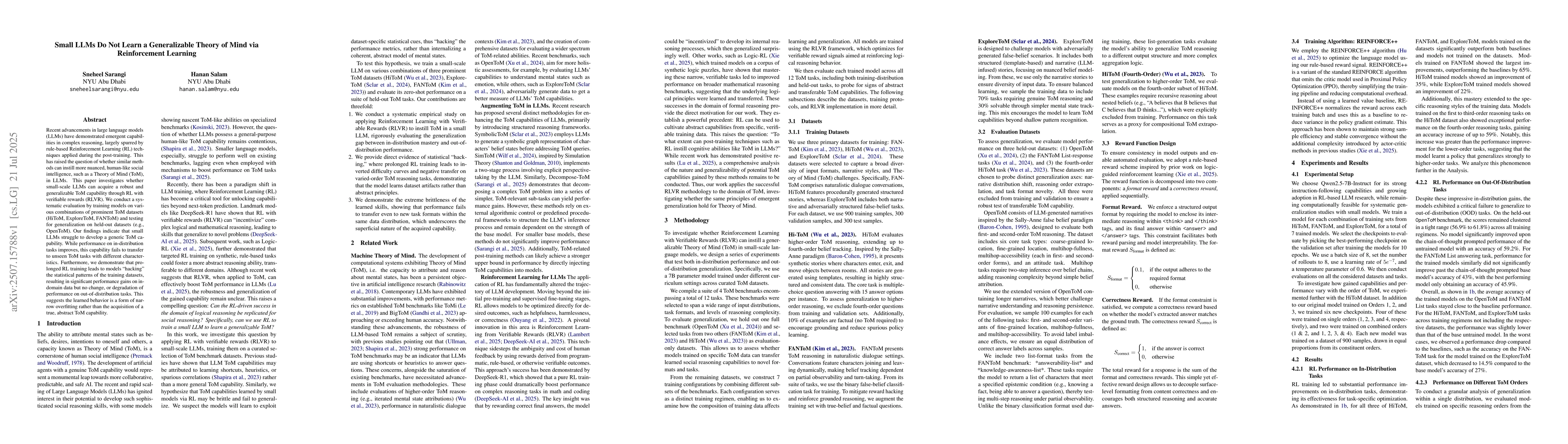 Recent advancements in large language models (LLMs) have demonstrated emergent capabilities in complex reasoning, largely spurred by rule-based Reinforcement Learning (RL) techniques applied during the post-training. This has raised the question of whether similar methods can instill more nuanced, human-like social intelligence, such as a Theory of Mind (ToM), in LLMs. This paper investigates whether small-scale LLMs can acquire a robust and generalizable ToM capability through RL with verifiable rewards (RLVR). We conduct a systematic evaluation by training models on various combinations of prominent ToM datasets (HiToM, ExploreToM, FANToM) and testing for generalization on held-out datasets (e.g., OpenToM). Our findings indicate that small LLMs struggle to develop a generic ToM capability. While performance on in-distribution tasks improves, this capability fails to transfer to unseen ToM tasks with different characteristics. Furthermore, we demonstrate that prolonged RL training leads to models ``hacking'' the statistical patterns of the training datasets, resulting in significant performance gains on in-domain data but no change, or degradation of performance on out-of-distribution tasks. This suggests the learned behavior is a form of narrow overfitting rather than the acquisition of a true, abstract ToM capability.