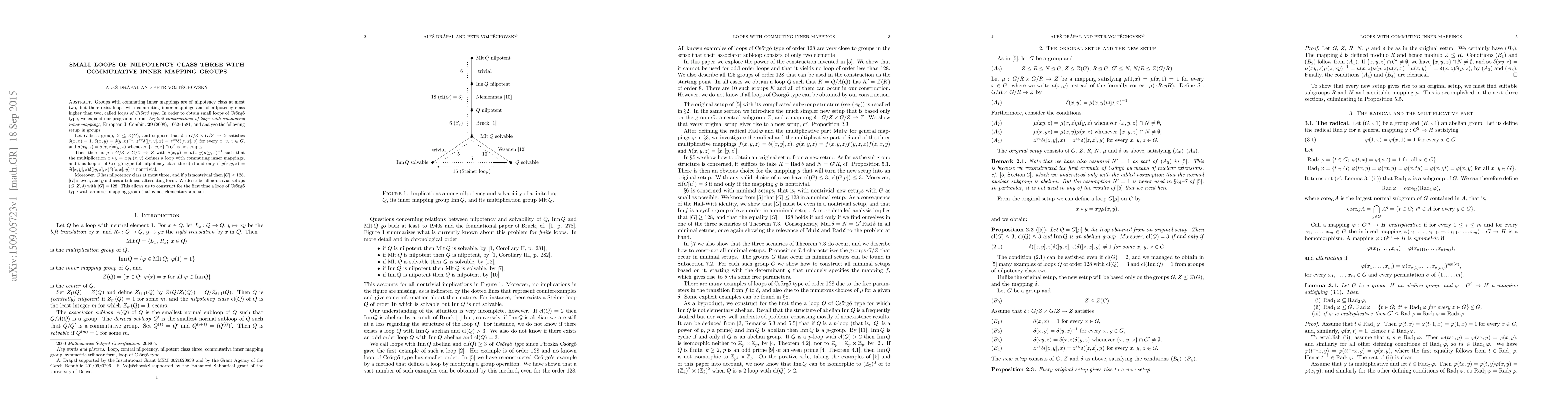 Groups with commuting inner mappings are of nilpotency class at most two, but there exist loops with commuting inner mappings and of nilpotency class higher than two, called loops of Cs\"org\H{o} type. In order to obtain small loops of Cs\"org\H{o} type, we expand our programme from `Explicit constructions of loops with commuting inner mappings', European J. Combin. 29 (2008), 1662-1681, and analyze the following setup in groups: Let $G$ be a group, $Z\le Z(G)$, and suppose that $\delta:G/Z\times G/Z\to Z$ satisfies $\delta(x,x)=1$, $\delta(x,y)=\delta(y,x)^{-1}$, $z^{yx}\delta([z,y],x) = z^{xy}\delta([z,x],y)$ for every $x$, $y$, $z\in G$, and $\delta(xy,z) = \delta(x,z)\delta(y,z)$ whenever $\{x,y,z\}\cap G'$ is not empty. Then there is $\mu:G/Z\times G/Z\to Z$ with $\delta(x,y) = \mu(x,y)\mu(y,x)^{-1}$ such that the multiplication $x*y=xy\mu(x,y)$ defines a loop with commuting inner mappings, and this loop is of Cs\"org\H{o} type (of nilpotency class three) if and only if $g(x,y,z) = \delta([x,y],z)\delta([y,z],x)\delta([z,x],y)$ is nontrivial. Moreover, $G$ has nilpotency class at most three, and if $g$ is nontrivial then $|G|\ge 128$, $|G|$ is even, and $g$ induces a trilinear alternating form. We describe all nontrivial setups $(G,Z,\delta)$ with $|G|=128$. This allows us to construct for the first time a loop of Cs\"org\H{o} type with an inner mapping group that is not elementary abelian.