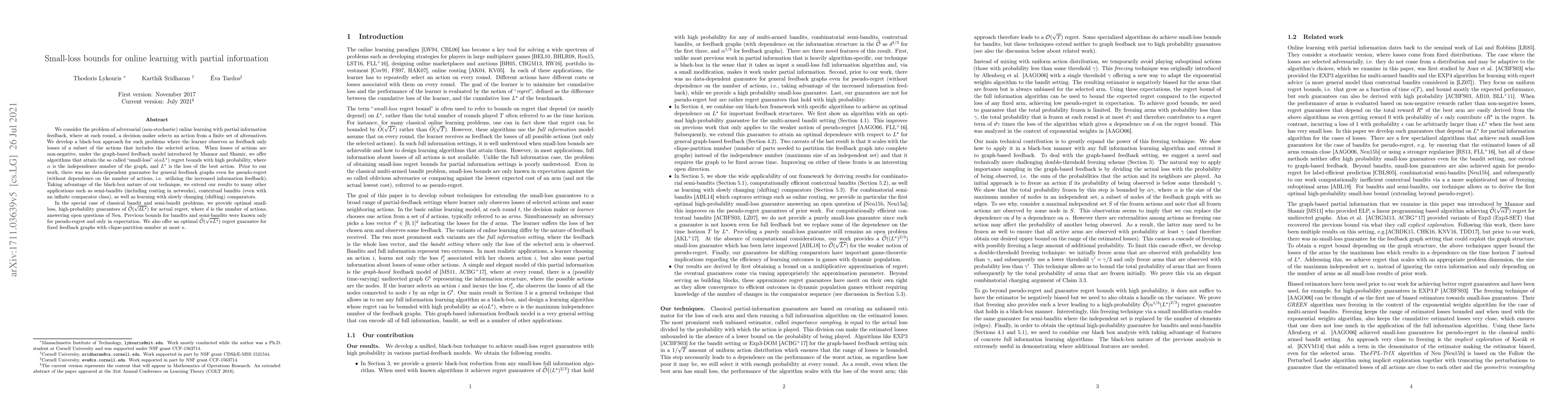 We consider the problem of adversarial (non-stochastic) online learning with partial information feedback, where at each round, a decision maker selects an action from a finite set of alternatives. We develop a black-box approach for such problems where the learner observes as feedback only losses of a subset of the actions that includes the selected action. When losses of actions are non-negative, under the graph-based feedback model introduced by Mannor and Shamir, we offer algorithms that attain the so called "small-loss" $o(\alpha L^{\star})$ regret bounds with high probability, where $\alpha$ is the independence number of the graph, and $L^{\star}$ is the loss of the best action. Prior to our work, there was no data-dependent guarantee for general feedback graphs even for pseudo-regret (without dependence on the number of actions, i.e. utilizing the increased information feedback). Taking advantage of the black-box nature of our technique, we extend our results to many other applications such as semi-bandits (including routing in networks), contextual bandits (even with an infinite comparator class), as well as learning with slowly changing (shifting) comparators. In the special case of classical bandit and semi-bandit problems, we provide optimal small-loss, high-probability guarantees of $\tilde{O}(\sqrt{dL^{\star}})$ for actual regret, where $d$ is the number of actions, answering open questions of Neu. Previous bounds for bandits and semi-bandits were known only for pseudo-regret and only in expectation. We also offer an optimal $\tilde{O}(\sqrt{\kappa L^{\star}})$ regret guarantee for fixed feedback graphs with clique-partition number at most $\kappa$.