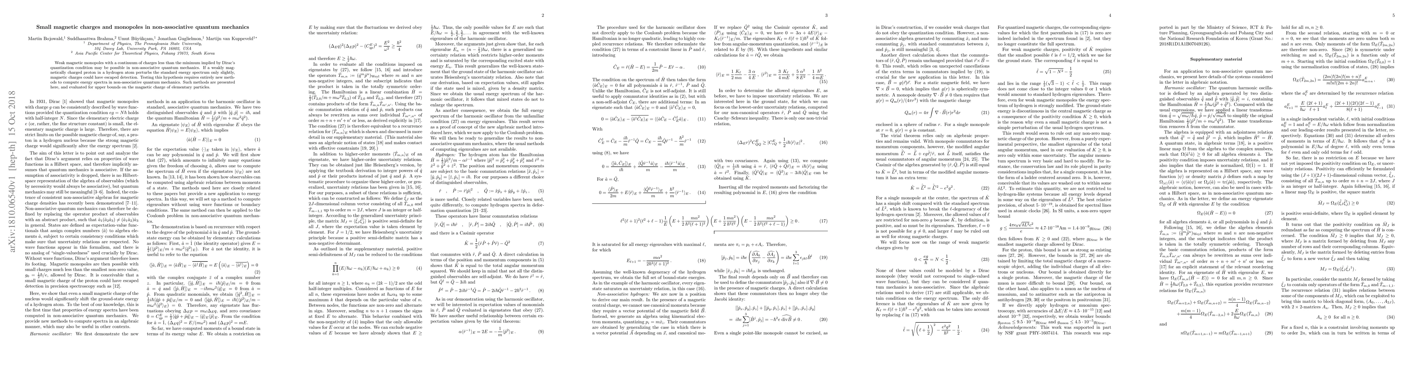 Weak magnetic monopoles with a continuum of charges less than the minimum implied by Dirac's quantization condition may be possible in non-associative quantum mechanics. If a weakly magnetically charged proton in a hydrogen atom perturbs the standard energy spectrum only slightly, magnetic charges could have escaped detection. Testing this hypothesis requires entirely new methods to compute energy spectra in non-associative quantum mechanics. Such methods are presented here, and evaluated for upper bounds on the magnetic charge of elementary particles.