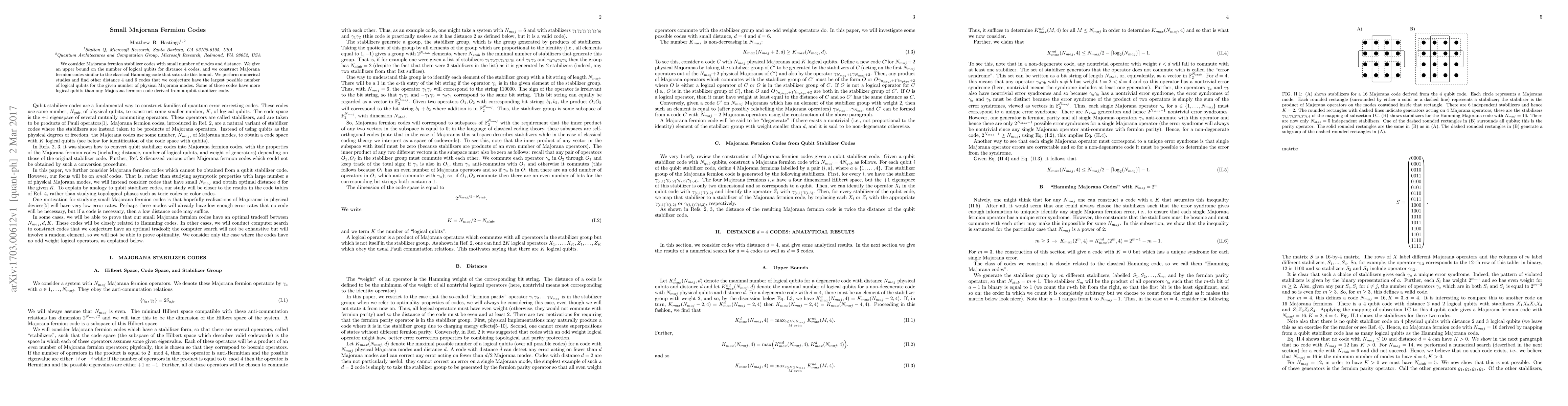 We consider Majorana fermion stabilizer codes with small number of modes and distance. We give an upper bound on the number of logical qubits for distance $4$ codes, and we construct Majorana fermion codes similar to the classical Hamming code that saturate this bound. We perform numerical studies and find other distance $4$ and $6$ codes that we conjecture have the largest possible number of logical qubits for the given number of physical Majorana modes. Some of these codes have more logical qubits than any Majorana fermion code derived from a qubit stabilizer code.