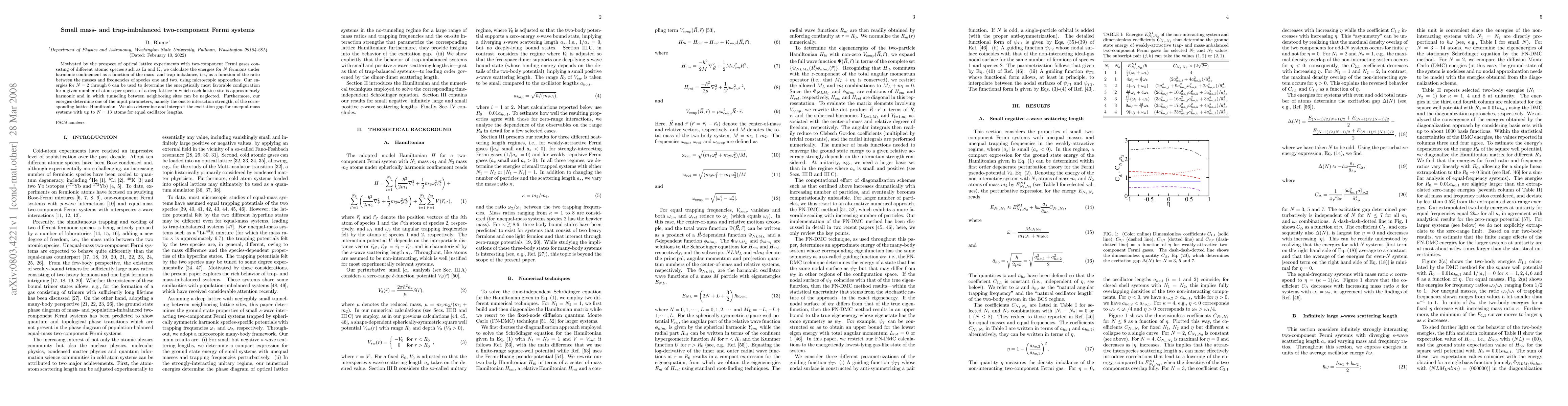 This research calculates energies for N fermions in harmonic confinement, varying mass and trap-imbalance for species like Li and K. It determines favorable configurations for lattice sites, input parameters like onsite interaction strength, and excitation gaps for unequal-mass systems up to 13 atoms.