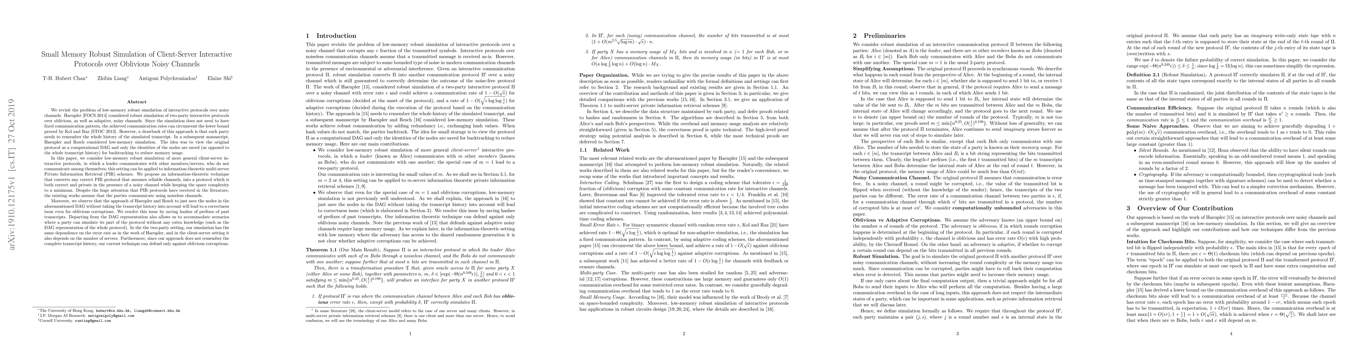 We revisit the problem of low-memory robust simulation of interactive protocols over noisy channels. Haeupler [FOCS 2014] considered robust simulation of two-party interactive protocols over oblivious, as well as adaptive, noisy channels. Since the simulation does not need to have fixed communication pattern, the achieved communication rates can circumvent the lower bound proved by Kol and Raz [STOC 2013]. However, a drawback of this approach is that each party needs to remember the whole history of the simulated transcript. In a subsequent manuscript, Haeupler and Resch considered low-memory simulation. The idea was to view the original protocol as a computational DAG and only the identities of the nodes are saved (as opposed to the whole transcript history) for backtracking to reduce memory usage. In this paper, we consider low-memory robust simulation of more general client-server interactive protocols, in which a leader communicates with other members/servers, who do not communicate among themselves; this setting can be applied to information-theoretic multi-server Private Information Retrieval (PIR) schemes. We propose an information-theoretic technique that converts any correct PIR protocol that assumes reliable channels, into a protocol which is both correct and private in the presence of a noisy channel while keeping the space complexity to a minimum. Despite the huge attention that PIR protocols have received in the literature, the existing works assume that the parties communicate using noiseless channels.