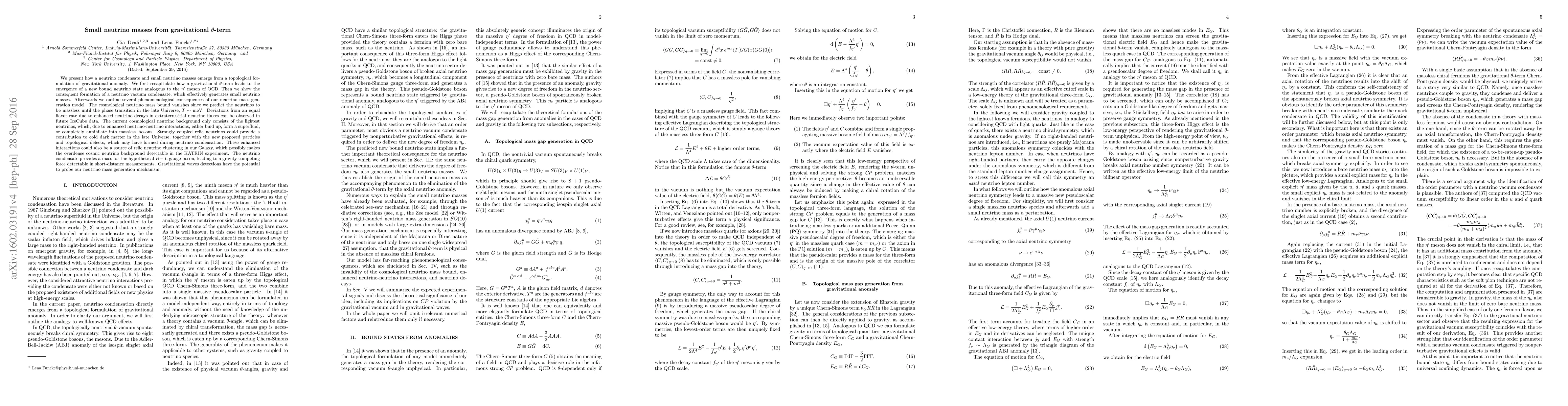 We present how a neutrino condensate and small neutrino masses emerge from a topological formulation of gravitational anomaly. We first recapitulate how a gravitational $\theta$-term leads to the emergence of a new bound neutrino state analogous to the $\eta'$ meson of QCD. Then we show the consequent formation of a neutrino vacuum condensate, which effectively generates small neutrino masses. Afterwards we outline several phenomenological consequences of our neutrino mass generation model. The cosmological neutrino mass bound vanishes since we predict the neutrinos to be massless until the phase transition in the late Universe, $T\sim {\rm meV}$. Deviations from an equal flavor rate due to enhanced neutrino decays in extraterrestrial neutrino fluxes can be observed in future IceCube data. The current cosmological neutrino background only consists of the lightest neutrinos, which, due to enhanced neutrino-neutrino interactions, either bind up, form a superfluid, or completely annihilate into massless bosons. Strongly coupled relic neutrinos could provide a contribution to cold dark matter in the late Universe, together with the new proposed particles and topological defects, which may have formed during neutrino condensation. These enhanced interactions could also be a source of relic neutrino clustering in our Galaxy, which possibly makes the overdense cosmic neutrino background detectable in the KATRIN experiment. The neutrino condensate provides a mass for the hypothetical $B-L$ gauge boson, leading to a gravity-competing force detectable in short-distance measurements. Gravitational waves detections have the potential to probe our neutrino mass generation mechanism.