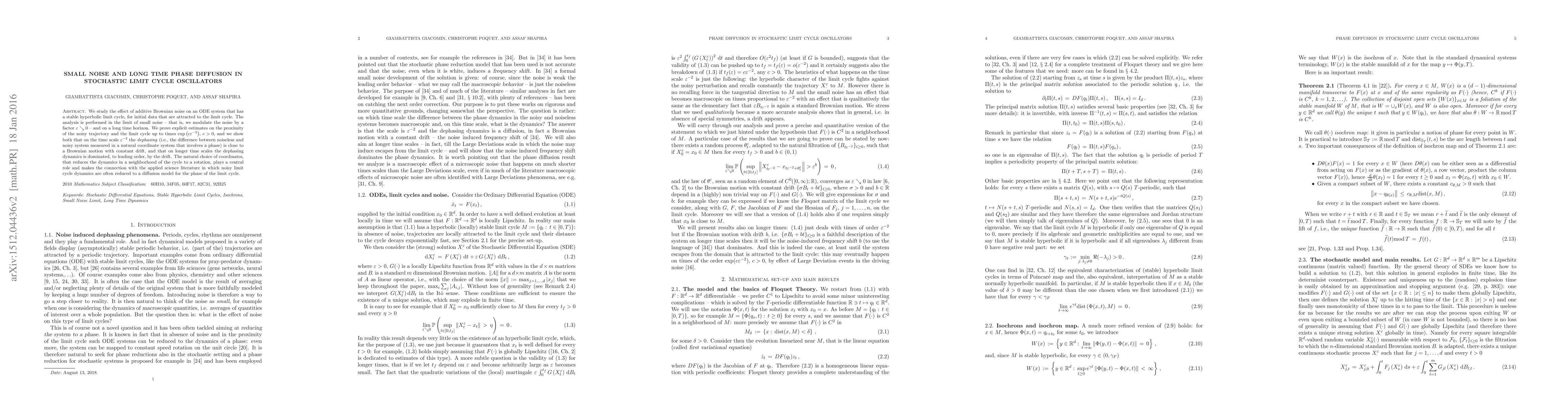 This research connects with applied science literature, reducing noisy limit cycle dynamics to a diffusion model for the phase of the limit cycle, providing insights into the long-term behavior of stochastic oscillators near stable limit cycles.