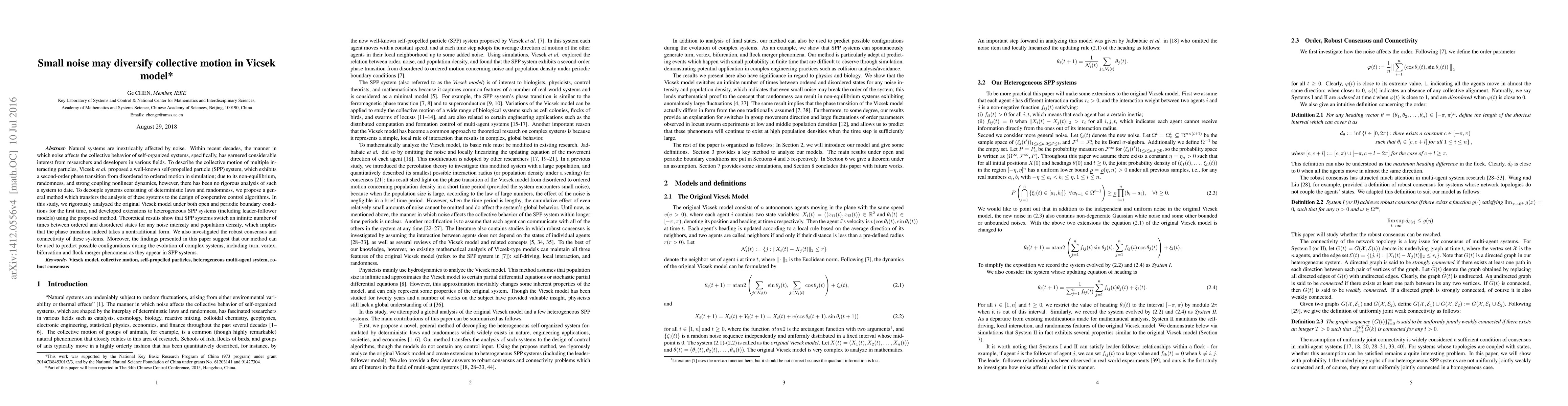 This paper rigorously analyzes the Vicsek model, revealing that small noise can diversify collective motion, leading to an infinite number of transitions between ordered and disordered states. The proposed method for decoupling deterministic laws and randomness can predict complex system configurations, including flock merger phenomena.