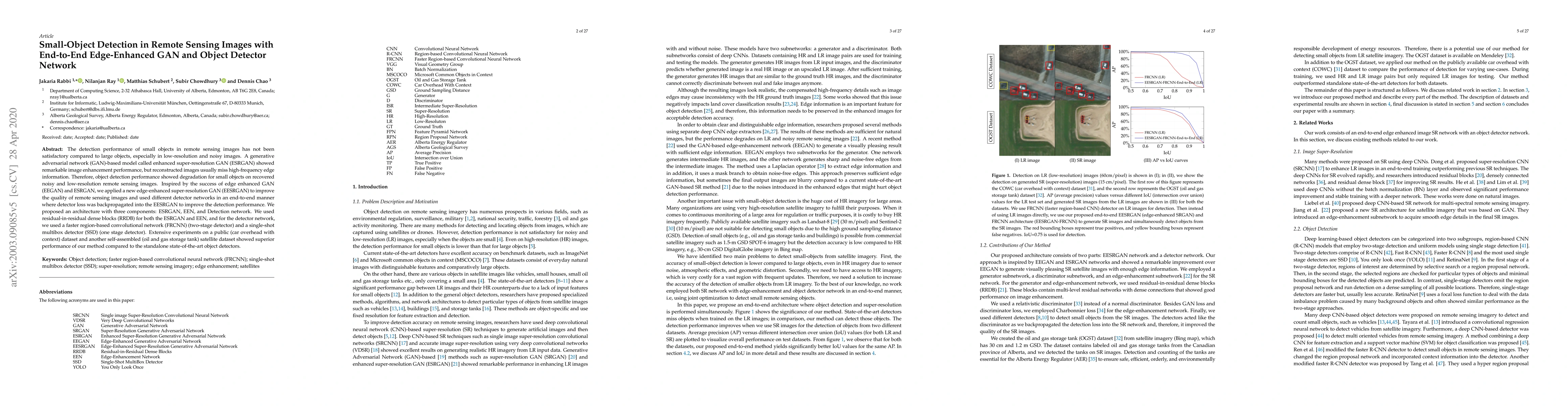 This paper proposes an end-to-end edge-enhanced super-resolution GAN (EESRGAN) to improve small object detection in remote sensing images. The EESRGAN combines ESRGAN for image enhancement and EEN for edge information preservation, followed by FRCNN and SSD for detection, achieving superior performance over standalone detectors.