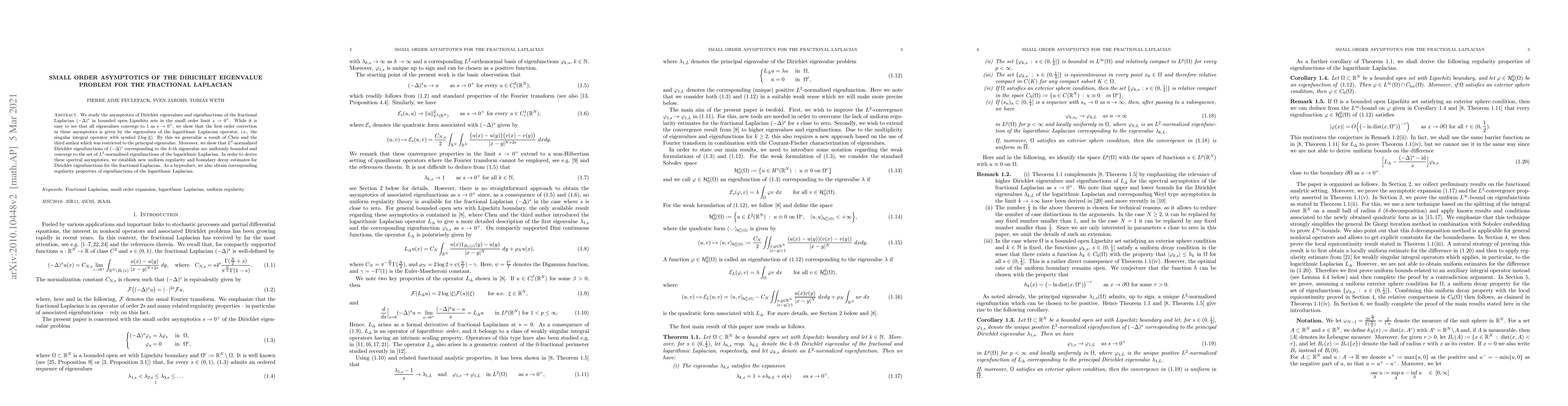 This paper investigates the small order asymptotics of Dirichlet eigenvalues and eigenfunctions of the fractional Laplacian $(-\Delta)^s$ as $s \to 0^+$, showing the first correction involves the logarithmic Laplacian and proving uniform boundedness and convergence of eigenfunctions.