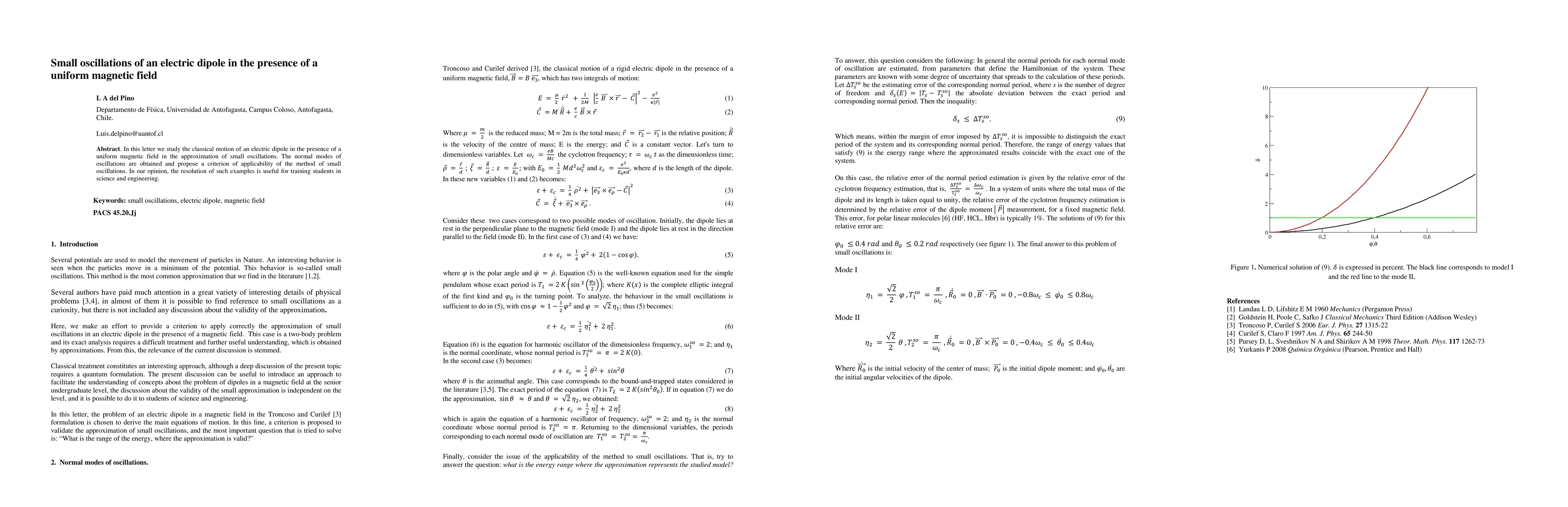 The research uses classical treatment and derivation of main equations of motion from Troncoso and Curilef's formulation to study the small oscillations of an electric dipole in a magnetic field.