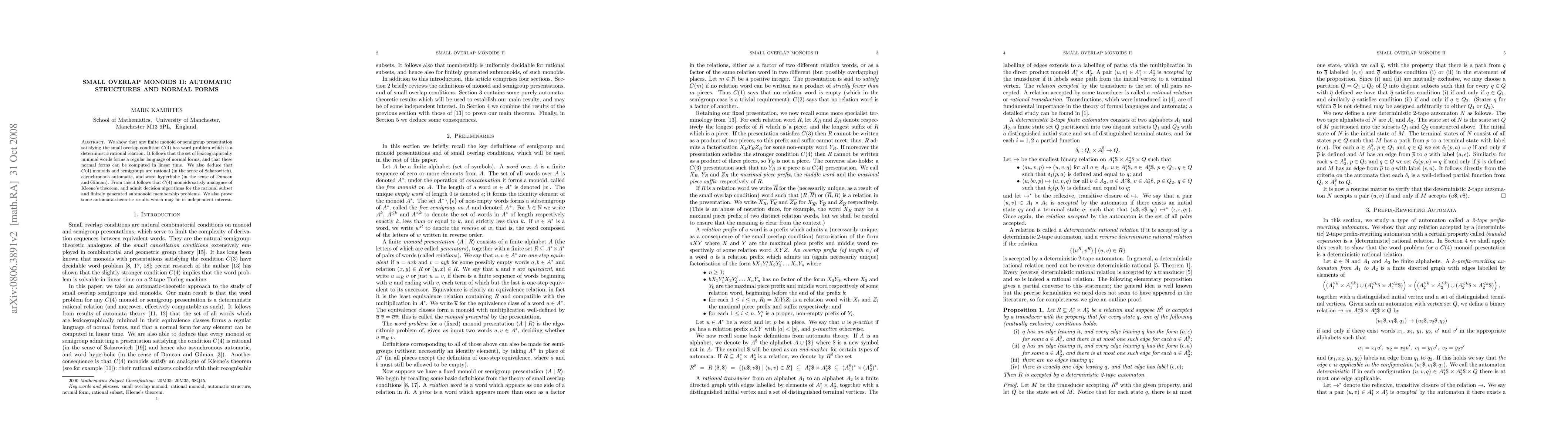 We show that any finite monoid or semigroup presentation satisfying the small overlap condition C(4) has word problem which is a deterministic rational relation. It follows that the set of lexicographically minimal words forms a regular language of normal forms, and that these normal forms can be computed in linear time. We also deduce that C(4) monoids and semigroups are rational (in the sense of Sakarovitch), asynchronous automatic, and word hyperbolic (in the sense of Duncan and Gilman). From this it follows that C(4) monoids satisfy analogues of Kleene's theorem, and admit decision algorithms for the rational subset and finitely generated submonoid membership problems. We also prove some automata-theoretic results which may be of independent interest.