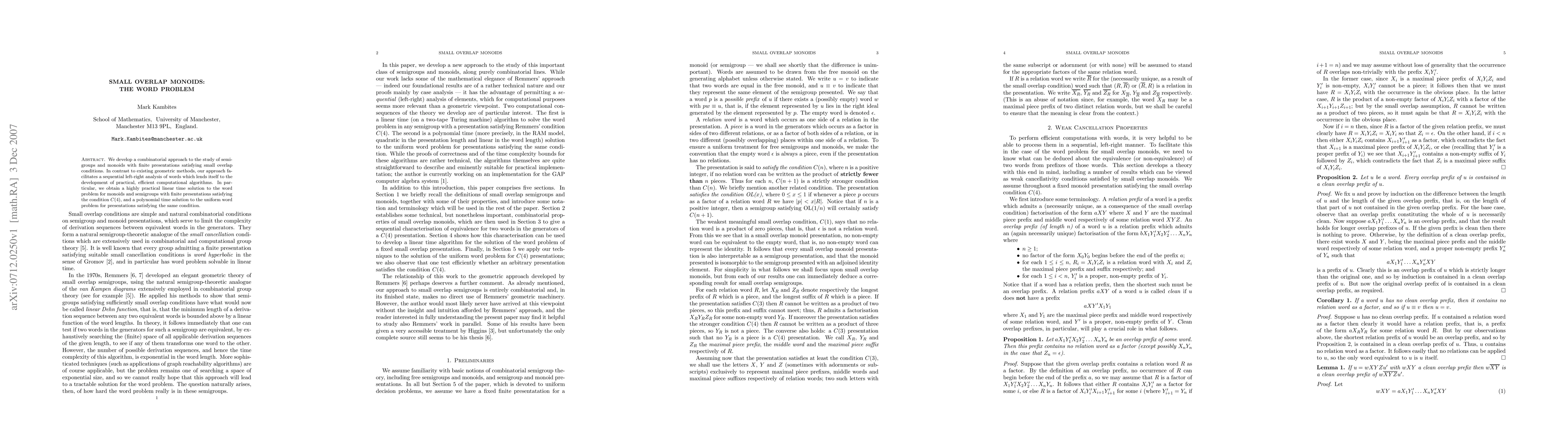 This paper introduces a combinatorial method for solving the word problem in semigroups and monoids with small overlap conditions, achieving linear time for monoids under condition C(4) and polynomial time for uniform word problems, offering practical computational algorithms.