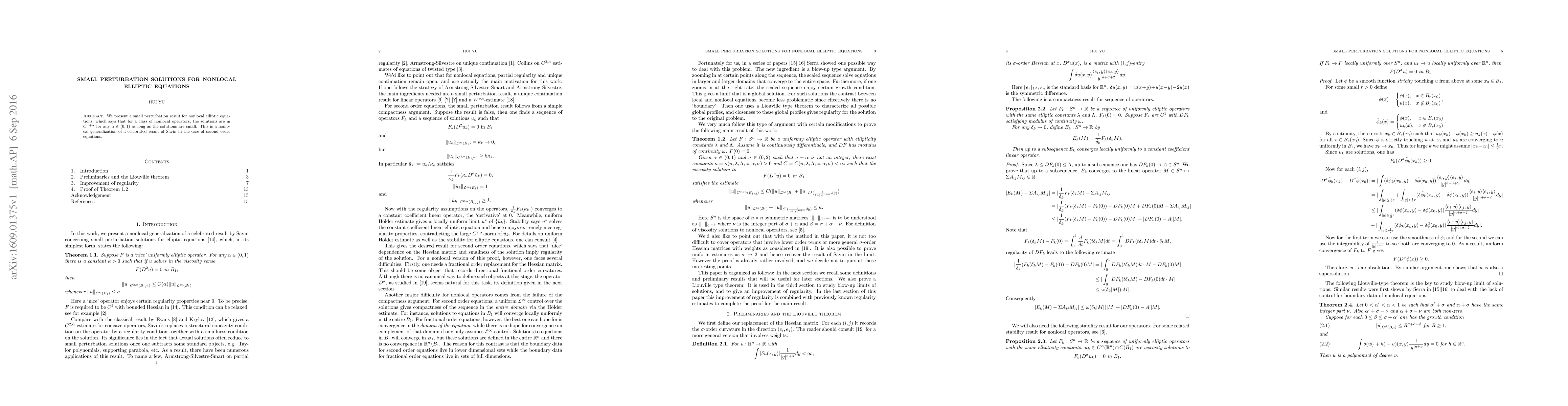 This paper presents a small perturbation result for nonlocal elliptic equations, showing that solutions belong to $C^{\sigma+\alpha}$ for any $\alpha\in (0,1)$ when solutions are sufficiently small, extending a classical result by Savin for second-order equations.