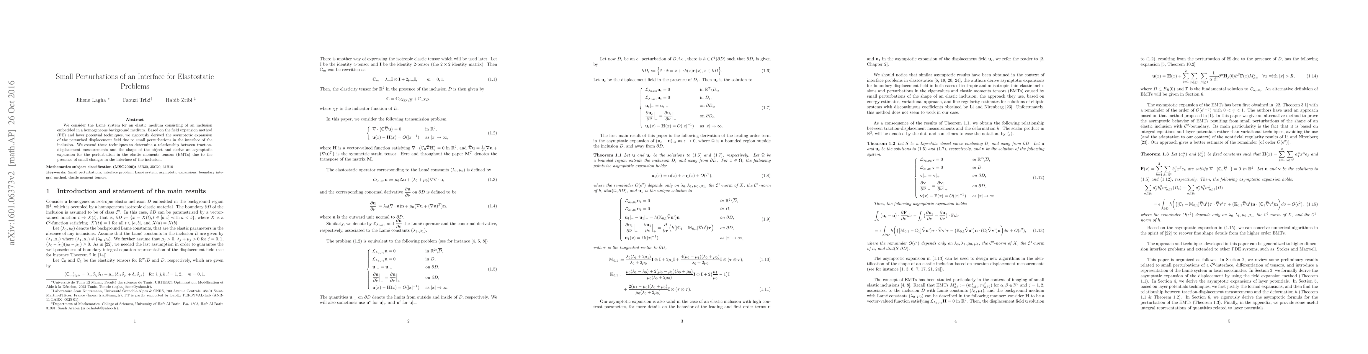 We consider solutions to the Lam\'e system in two dimensions. By using systematic way, based on layer potential techniques and the field expansion (FE) method (formal derivation), we establish a rigorous asymptotic expansion for the perturbations of the displacement field caused by small perturbations of the shape of an elastic inclusion with C2-boundary. We extend these techniques to determine a relationship between traction-displacement measurements and the shape of the object and derive an asymptotic expansion for the perturbation in the elastic moments tensors (EMTs) due to the presence of small changes in the interface of the inclusion.