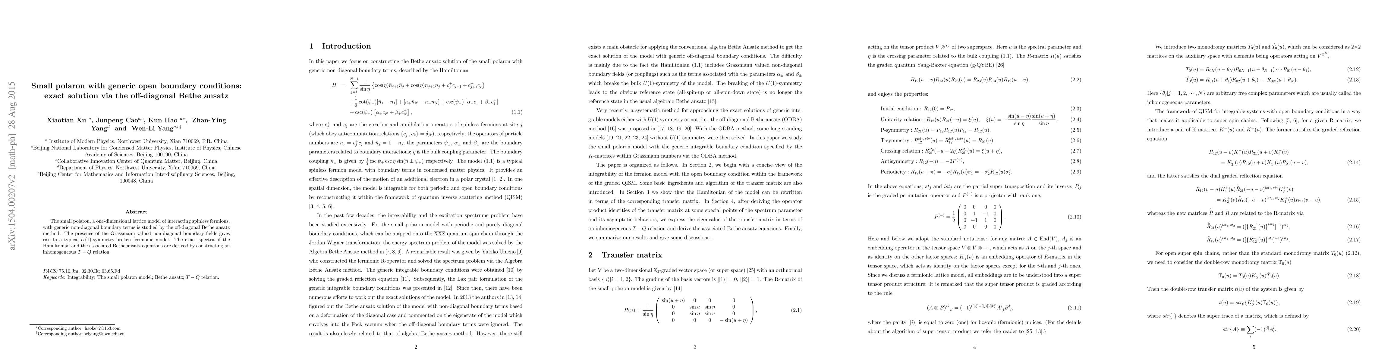 The small polaron, an one-dimensional lattice model of interacting spinless fermions, with generic non-diagonal boundary terms is studied by the off-diagonal Bethe ansatz method. The presence of the Grassmann valued non-diagonal boundary fields gives rise to a typical $U(1)$-symmetry-broken fermionic model. The exact spectra of the Hamiltonian and the associated Bethe ansatz equations are derived by constructing an inhomogeneous $T-Q$ relation.