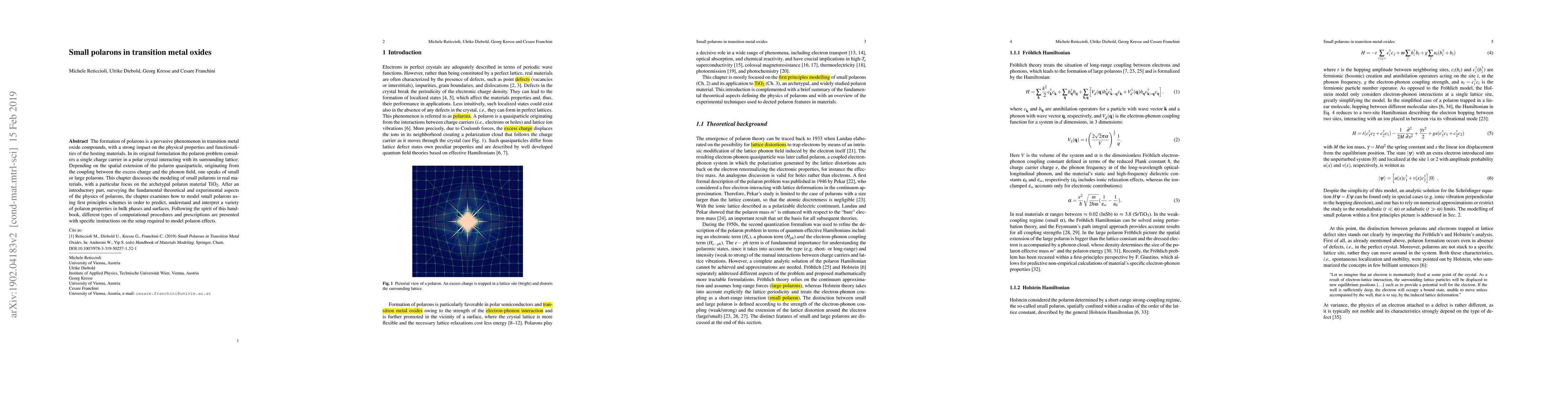 The formation of polarons is a pervasive phenomenon in transition metal oxide compounds, with a strong impact on the physical properties and functionalities of the hosting materials. In its original formulation the polaron problem considers a single charge carrier in a polar crystal interacting with its surrounding lattice. Depending on the spatial extension of the polaron quasiparticle, originating from the coupling between the excess charge and the phonon field, one speaks of small or large polarons. This chapter discusses the modeling of small polarons in real materials, with a particular focus on the archetypal polaron material TiO2. After an introductory part, surveying the fundamental theoretical and experimental aspects of the physics of polarons, the chapter examines how to model small polarons using first principles schemes in order to predict, understand and interpret a variety of polaron properties in bulk phases and surfaces. Following the spirit of this handbook, different types of computational procedures and prescriptions are presented with specific instructions on the setup required to model polaron effects.