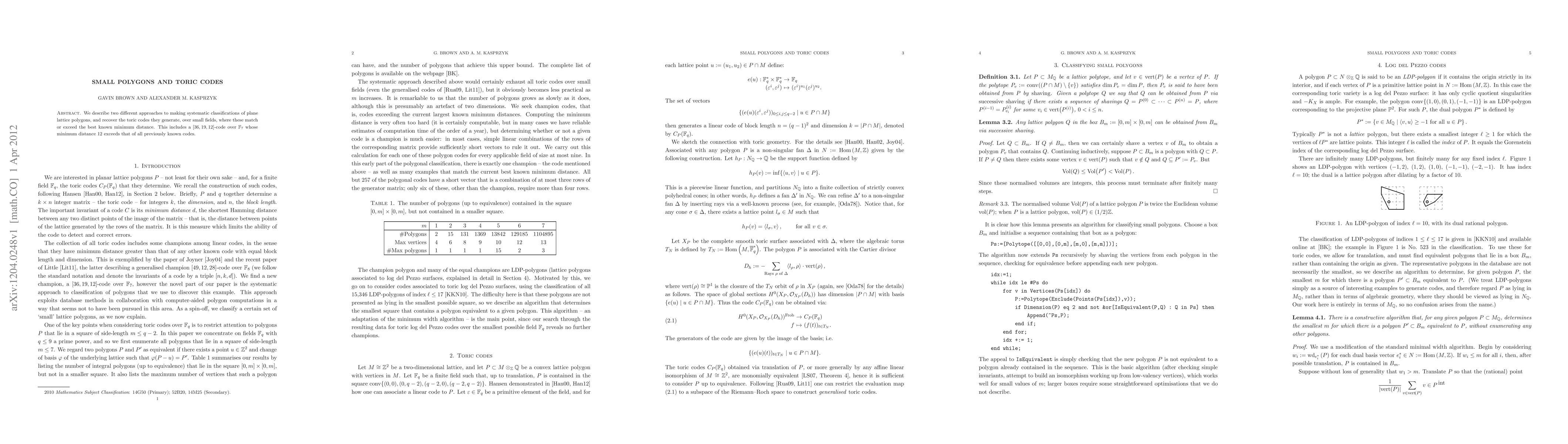 This paper presents two methods for systematically classifying plane lattice polygons and the toric codes they generate over small fields, achieving minimum distances that match or surpass the best known. Notably, it introduces a [36,19,12]-code over F_7 with a minimum distance of 12, outperforming all previously known codes.