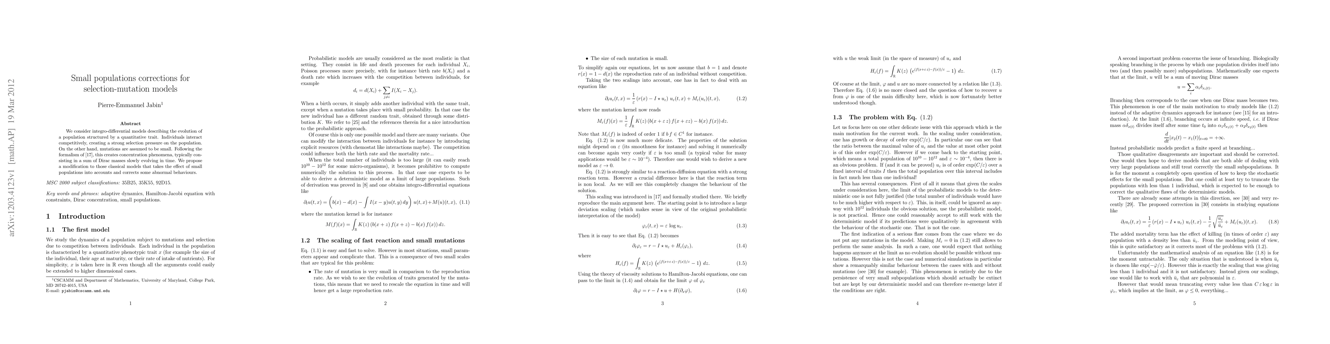 This paper proposes a modification to classical models of population evolution that takes into account small populations, correcting abnormal behaviors such as concentration phenomena. It aims to provide a more accurate representation of the interactions between individuals and mutations in a structured population.