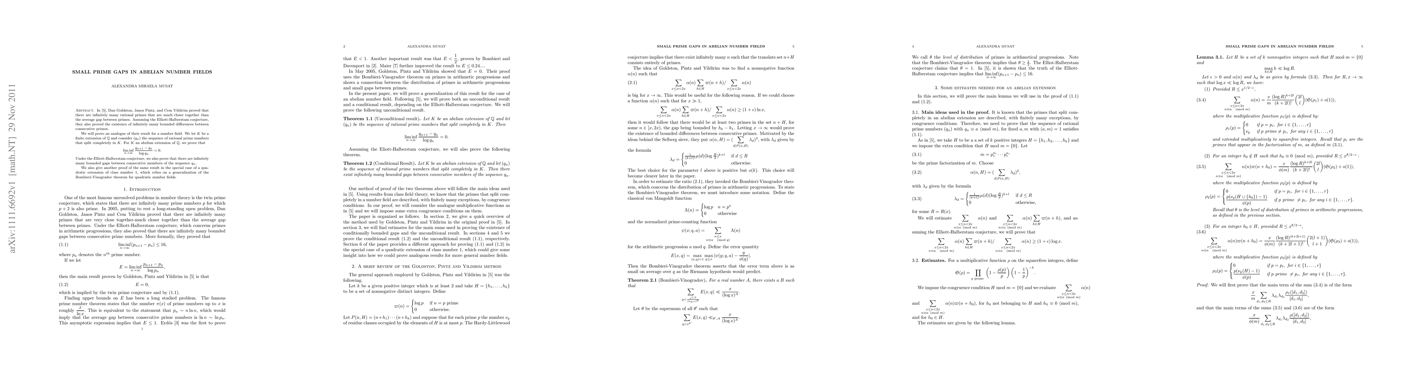 This paper proves an analogue of a result on small prime gaps in abelian number fields, providing both a conditional result under the Elliott-Halberstam conjecture and an unconditional result. It also offers a specialized proof for quadratic extensions of class number 1 using a generalized Bombieri-Vinogradov theorem.