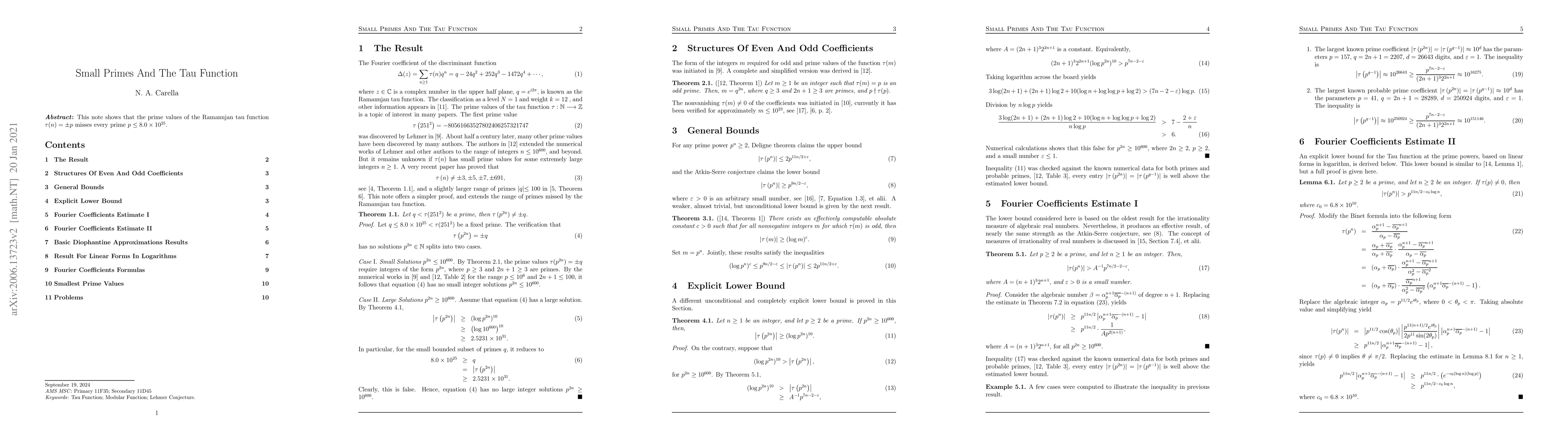 Summary: The paper demonstrates that the prime values of the Ramanujan tau function, $\tau(n)$, do not include any primes less than $8.0\times 10^{25}$; thus, it excludes all primes up to this magnitude.