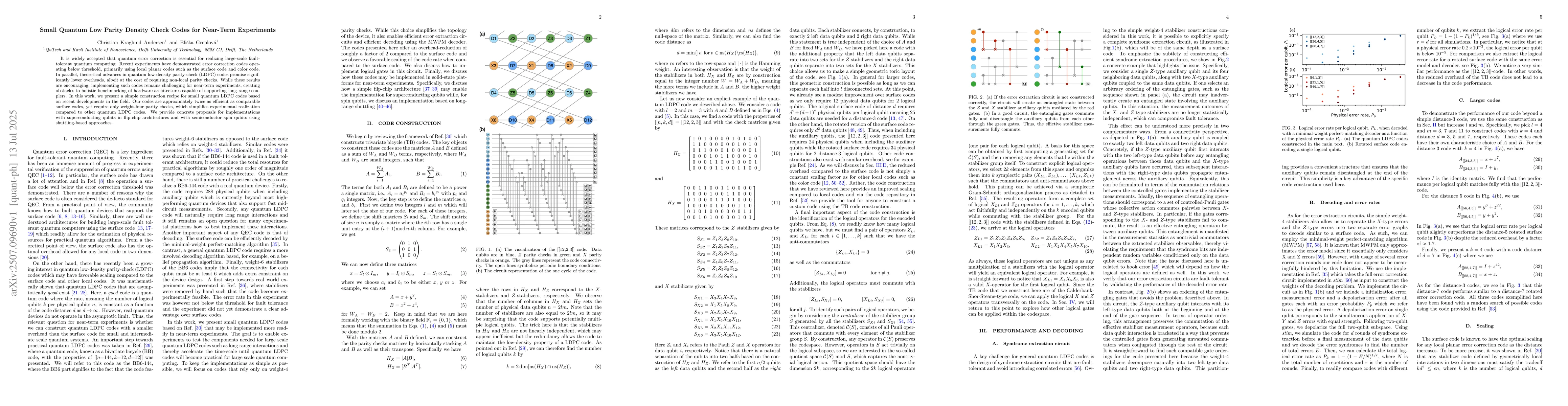 It is widely accepted that quantum error correction is essential for realizing large-scale fault-tolerant quantum computing. Recent experiments have demonstrated error correction codes operating below threshold, primarily using local planar codes such as the surface code and color code. In parallel, theoretical advances in quantum low-density parity-check (LDPC) codes promise significantly lower overheads, albeit at the cost of requiring non-local parity checks. While these results are encouraging, implementing such codes remains challenging for near-term experiments, creating obstacles to holistic benchmarking of hardware architectures capable of supporting long-range couplers. In this work, we present a simple construction recipe for small quantum LDPC codes based on recent developments in the field. Our codes are approximately twice as efficient as comparable surface codes, yet require only weight-four parity checks, which simplifies experimental realization compared to other quantum LDPC codes. We provide concrete proposals for implementations with superconducting qubits in flip-chip architectures and with semiconductor spin qubits using shuttling-based approaches.