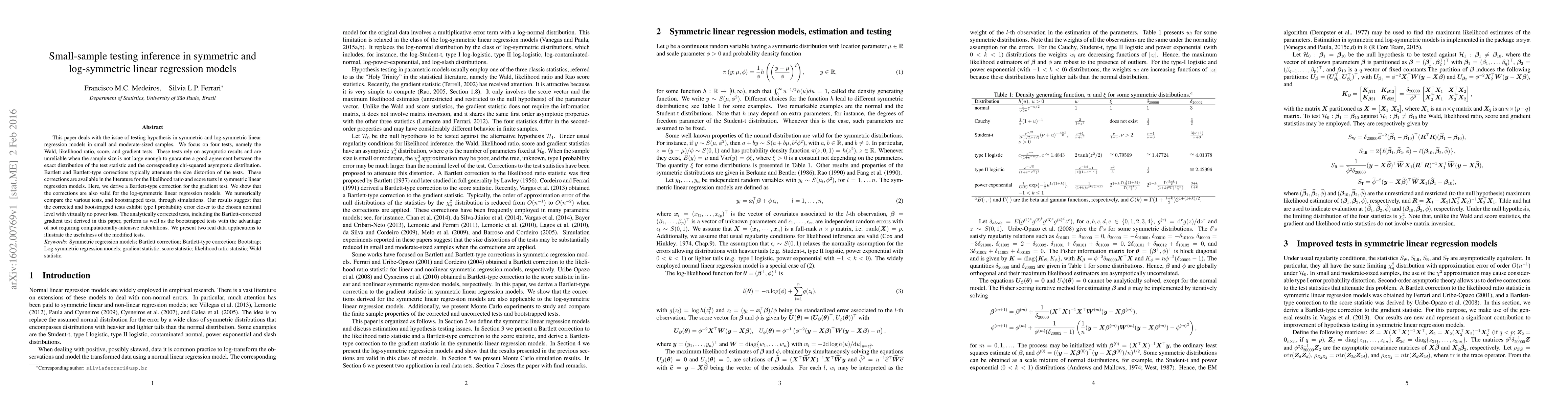 This paper investigates hypothesis testing in symmetric and log-symmetric linear regression models for small to moderate sample sizes, focusing on four tests: Wald, likelihood ratio, score, and gradient. It proposes a Bartlett-type correction for the gradient test and demonstrates its effectiveness through simulations, showing that the corrected tests maintain type I error rates close to the nominal level without significant power loss. The study concludes that analytically corrected tests perform as well as bootstrapped ones but without the computational burden.