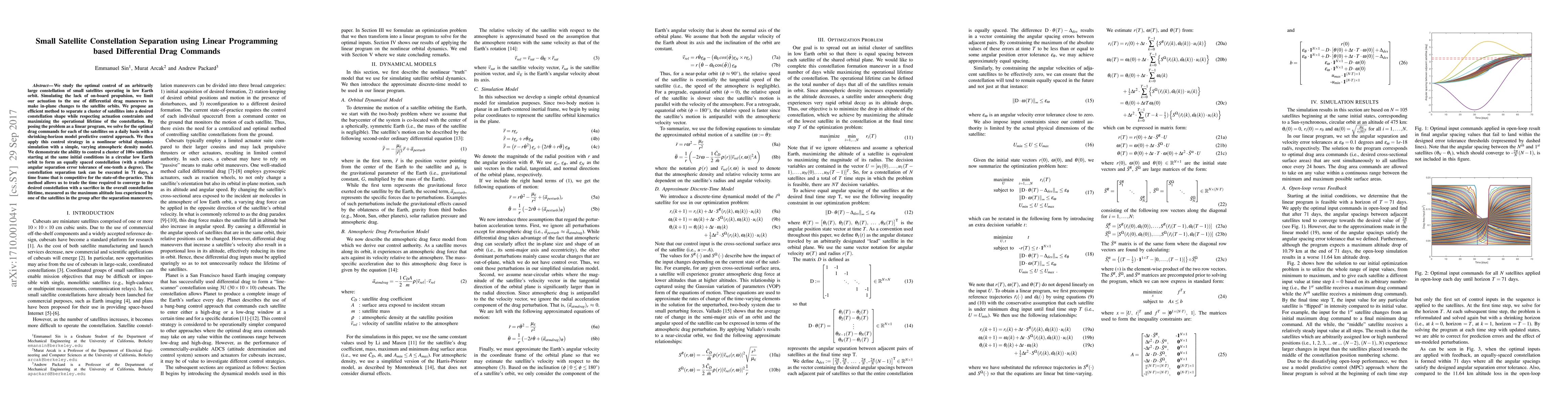 We study the optimal control of an arbitrarily large constellation of small satellites operating in low Earth orbit. Simulating the lack of on-board propulsion, we limit our actuation to the use of differential drag maneuvers to make in-plane changes to the satellite orbits. We propose an efficient method to separate a cluster of satellites into a desired constellation shape while respecting actuation constraints and maximizing the operational lifetime of the constellation. By posing the problem as a linear program, we solve for the optimal drag commands for each of the satellites on a daily basis with a shrinking-horizon model predictive control approach. We then apply this control strategy in a nonlinear orbital dynamics simulation with a simple, varying atmospheric density model. We demonstrate the ability to control a cluster of 100+ satellites starting at the same initial conditions in a circular low Earth orbit to form an equally spaced constellation (with a relative angular separation error tolerance of one-tenth a degree). The constellation separation task can be executed in 71 days, a time frame that is competitive for the state-of-the-practice. This method allows us to trade the time required to converge to the desired constellation with a sacrifice in the overall constellation lifetime, measured as the maximum altitude loss experienced by one of the satellites in the group after the separation maneuvers.